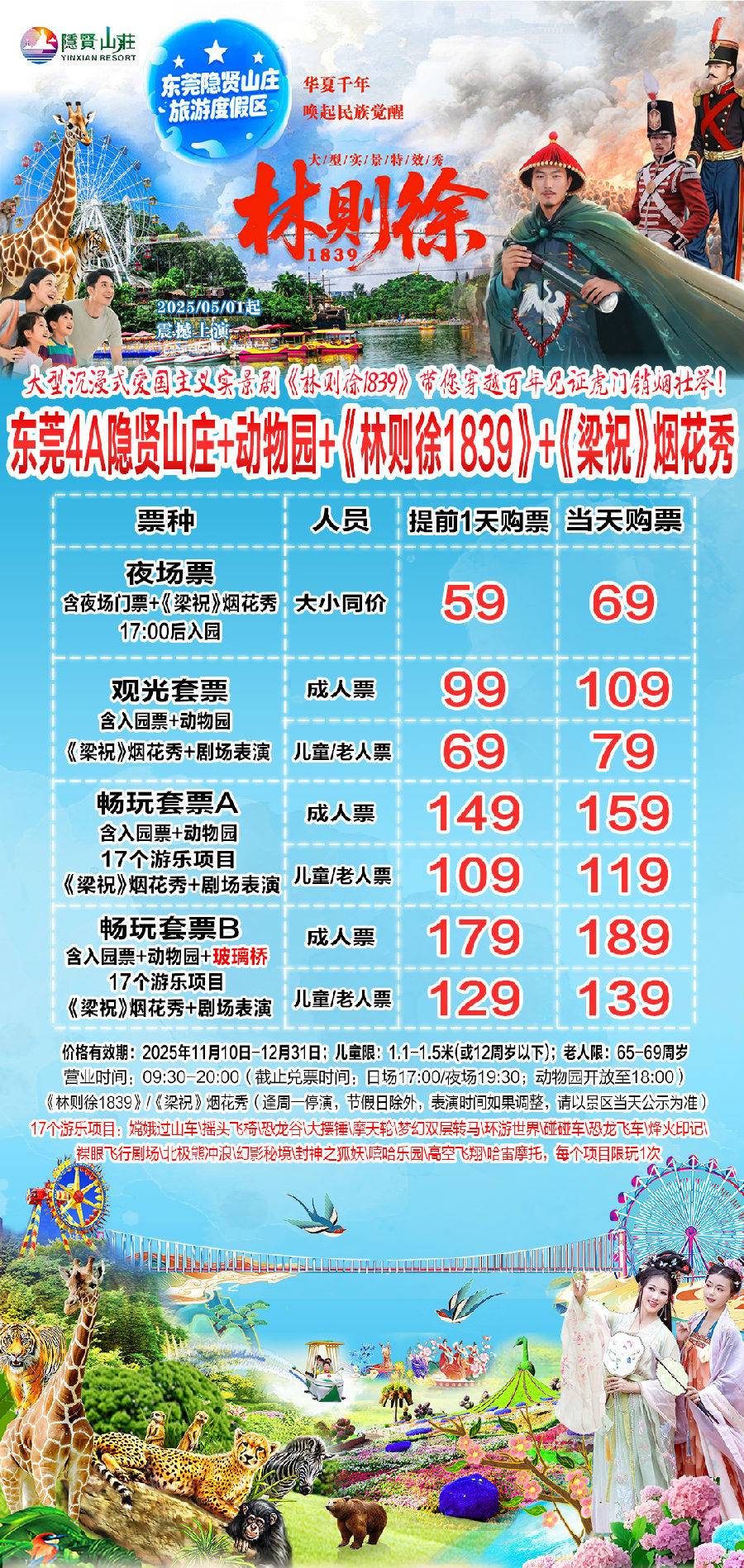 3、在法定节假日期间,门票不包含烟花秀座位票,具体费用以现场公示为准;景区营业时间、园区设施及剧场表演等开放时间如有调整,请以当日景区现场公示和通知为准。