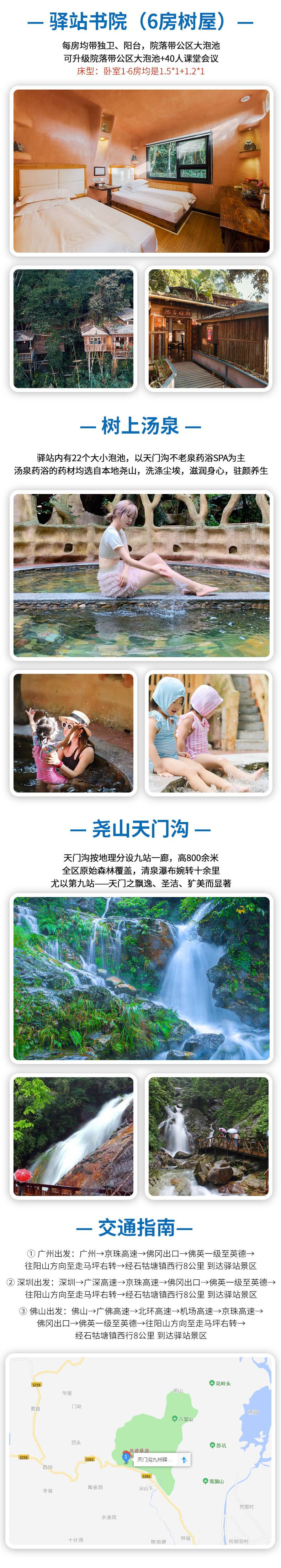 九州驿站清远英德天门沟驿站树屋村静立于石牯塘八宝围仔村——石门台自然保护区西部,是九州驿站首个建立在自然山野中的宿营地。天门沟按地理分九站一廊,源高1000余米,内有百余级流水瀑布,水质清澈、锦潭无数,饱满的负离子空气,让您心旷神怡。为进一步拉近人与自然的和谐共处,在尊重自然、尊重人文的基础上,九州驿站天门沟驿站相继建设了树屋村、树上温泉、树上餐厅等原生态旅游养生平台。宾客能无限亲近自然、亲近土地,是现代都市人梦寐以求的休闲养生之所。百个风情各异的树屋内屋村内配有现代无线网络和电视;入住于此,能与隔窗相望的雀鸟、昆虫、松鼠为伴,让宾客无限亲近自然,抛开世俗的喧嚣,回归自我。