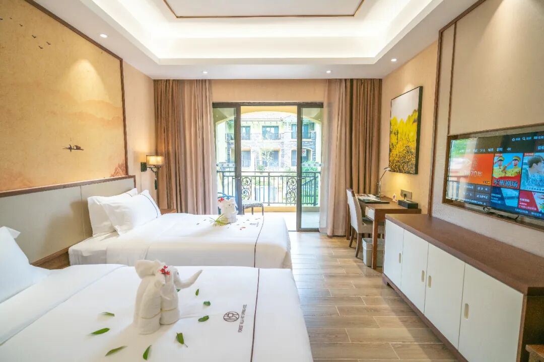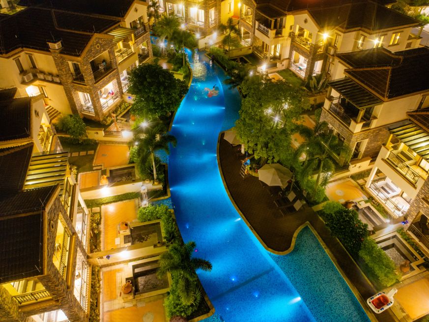 酒店现有506间客房全由西班牙风格美墅组成,泳 道增至数公里长,主干道8M宽,支干道约4-4.5M宽, 超大型中心戏水区已正式开放使用。泳道会所计划7月投入使用。计划三期开放温泉中心与半山别墅。