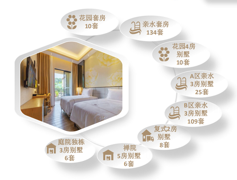 别墅引温泉水入户,除复式2房别墅和B区亲水三房别墅花园带一个私家温泉池外,其他所有房间都带一个私家温泉池,尊享私家温泉体验。