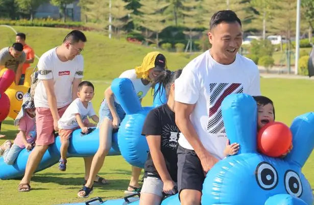 孩子和爸爸妈妈骑着毛毛虫一起冲出了起点。