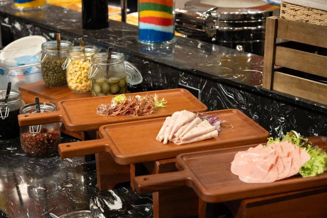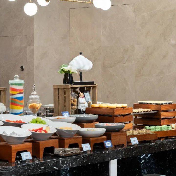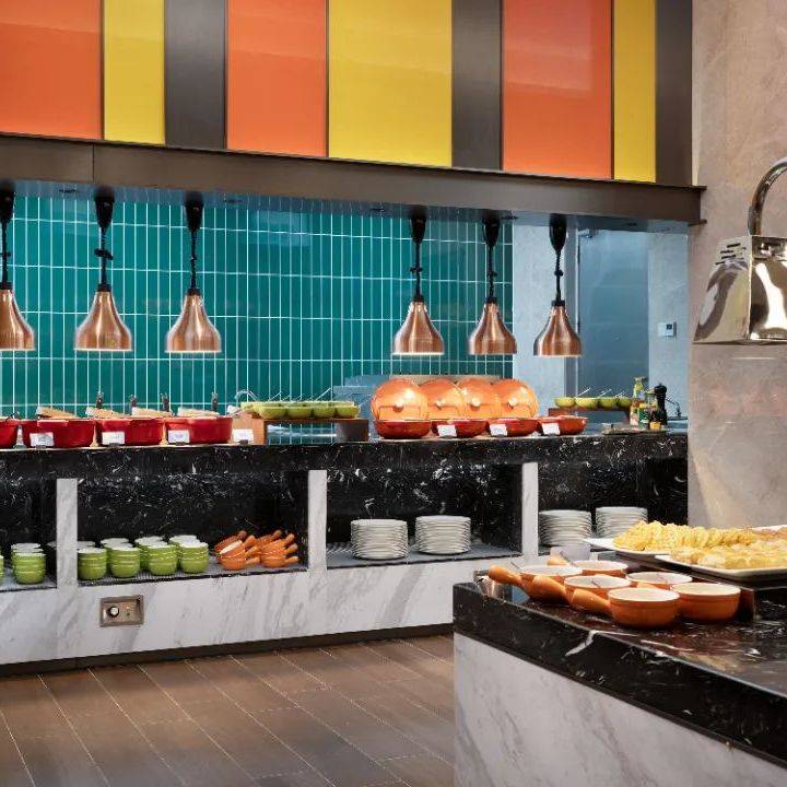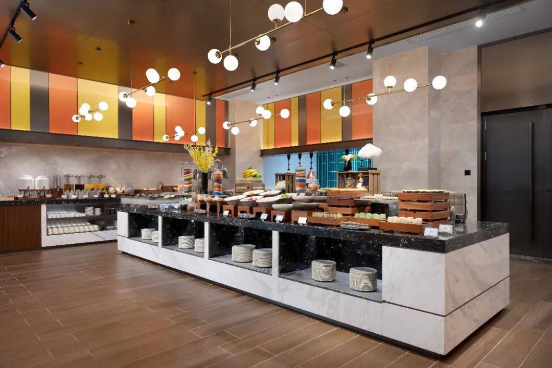 舒适用餐区,开放式厨房,简约现代的环境 、上百个品种的新鲜营养热早餐、种类丰富的简餐和蔬果、饮品为您全日提供高品质的健康饮食体验,让繁忙的旅途增添一份欢愉和安心。