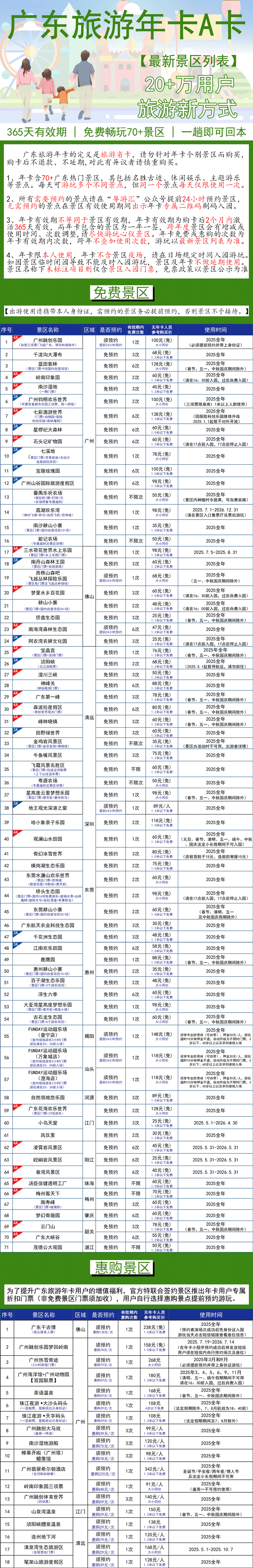 2、大部分的景区全年均可不预约即可使用,个别景区有使用时间、次数限制、须预约,出游前请查看“粤游汇”微信公众号最新年卡公告;年卡内包含的大部分景区1.2米(不含)以下儿童免票,详见景区列表说明,年龄太小的孩子请自行考虑是否购买。