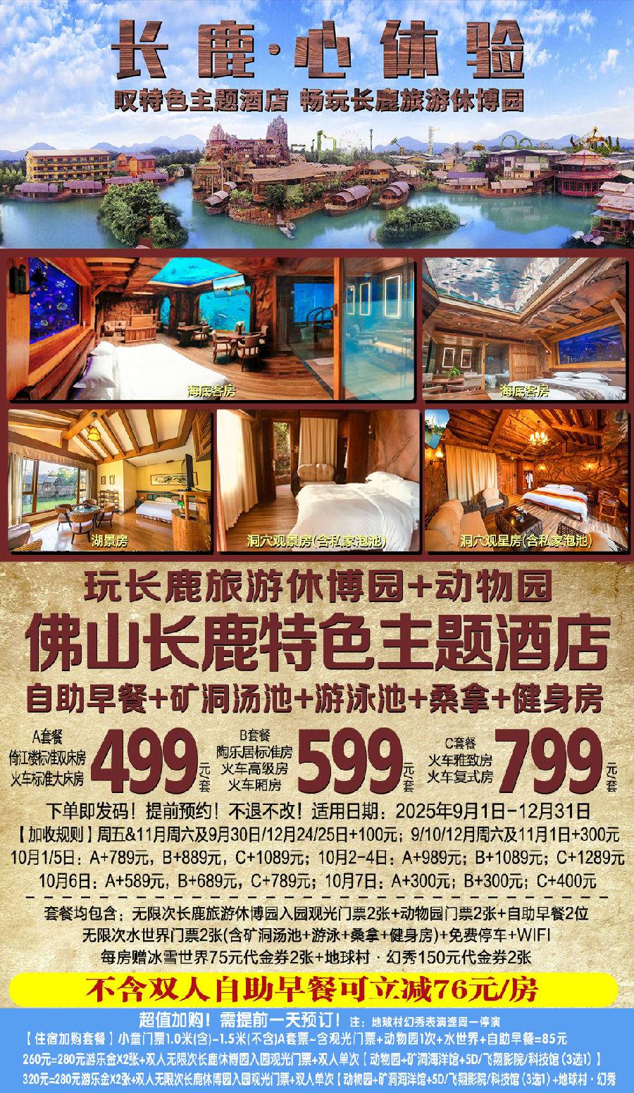 1、火车复式房/火车雅致房2选1+无限次长鹿旅游休博园入园观光门票2张+无限次水世界门票2张+动物园门票2张+自助早餐2位+【价值150元/张的地球村大马戏代金券2张+价值75元冰雪世界代金券2张,抵扣后需另外付费】;