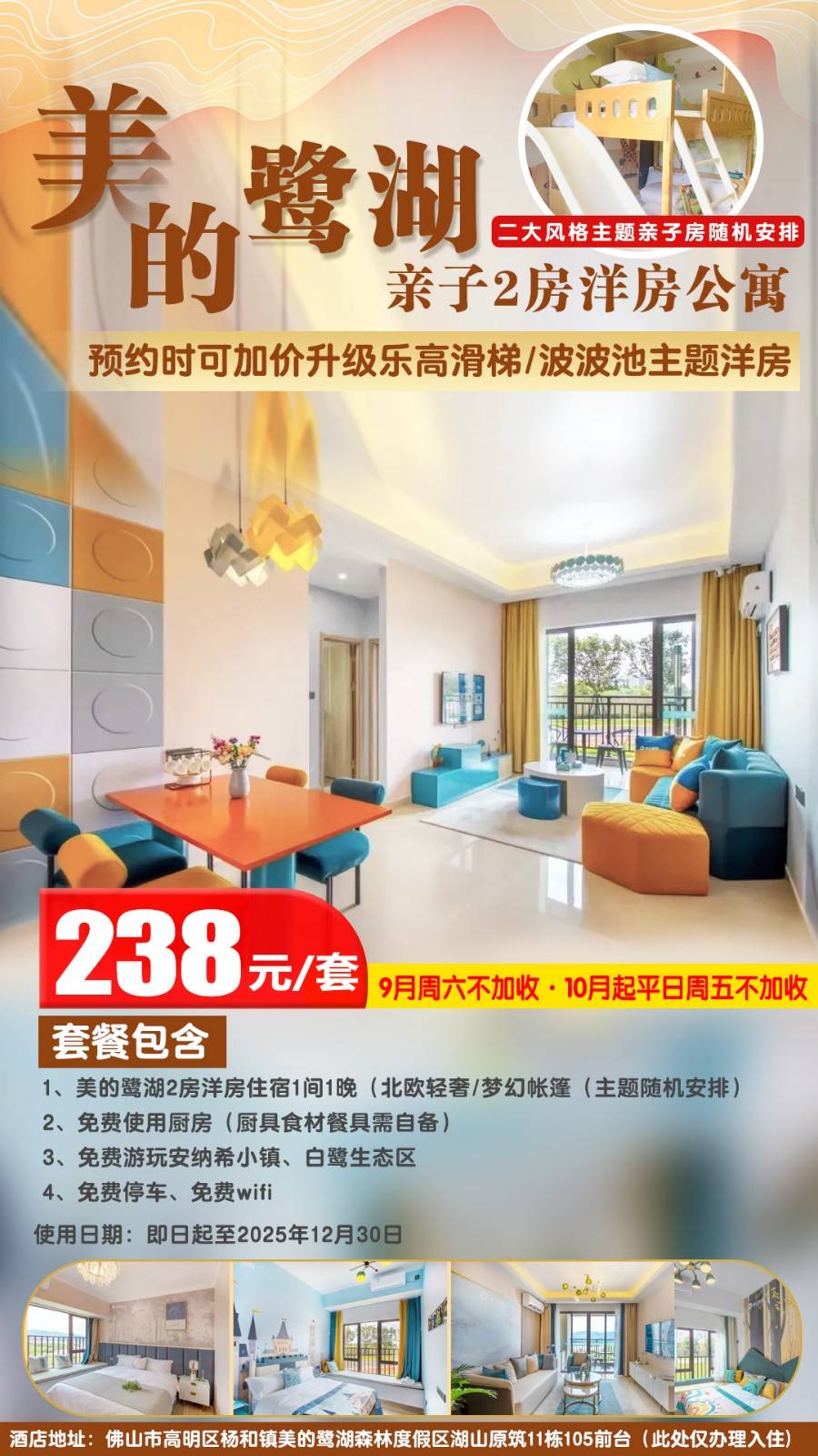 1、美的鹭湖2房洋房住宿1间1晚(北欧轻奢/梦幻帐篷(主题随机安排,不可指定)
