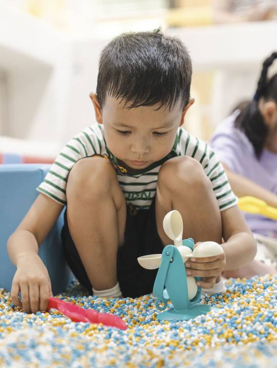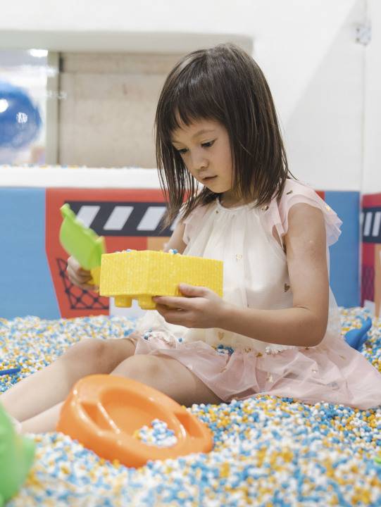 孩子们钻进粉蓝交织的球堆里玩捉迷藏