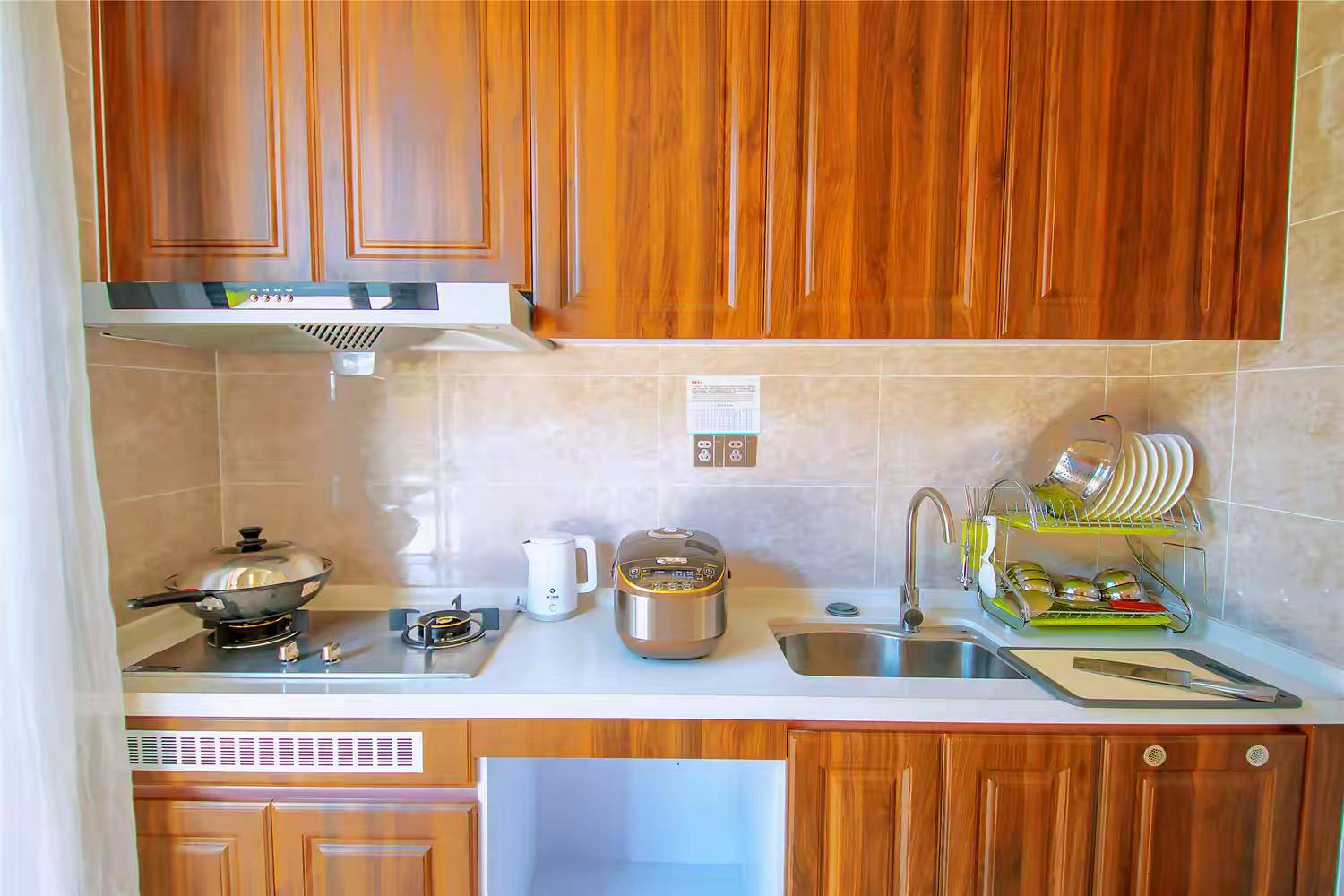 4、开放式厨房(提供天然气灶+电饭煲、电火锅、炒菜锅及菜铲、碗筷、菜盘、砧板、刀具/冰箱)