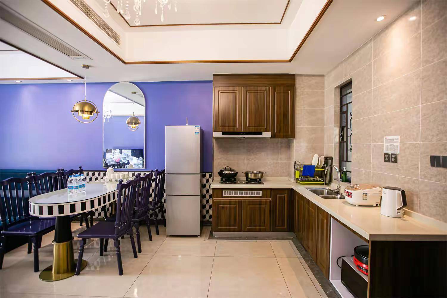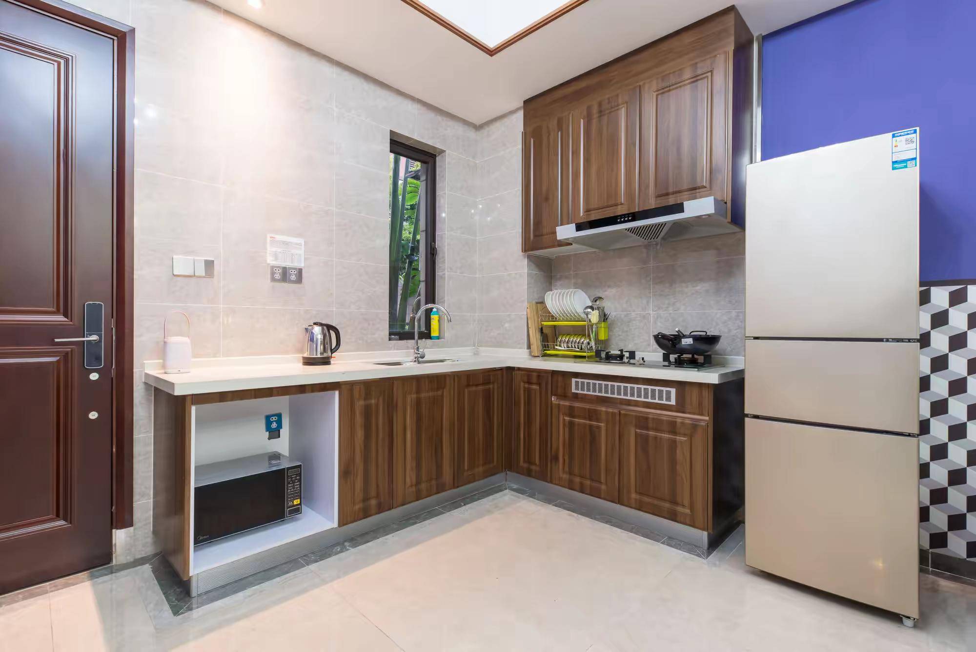 4、开放式厨房(提供天然气灶+电火锅+电饭煲+炒锅+冰箱+菜盘、砧板、刀具)