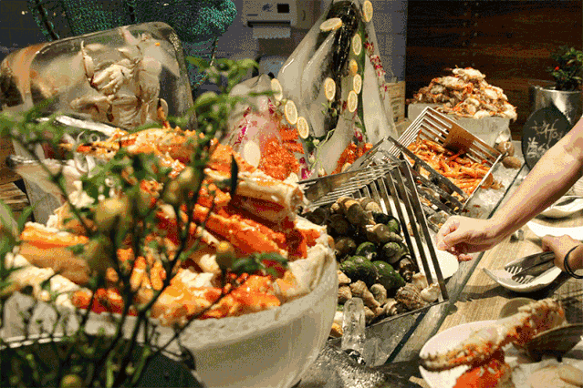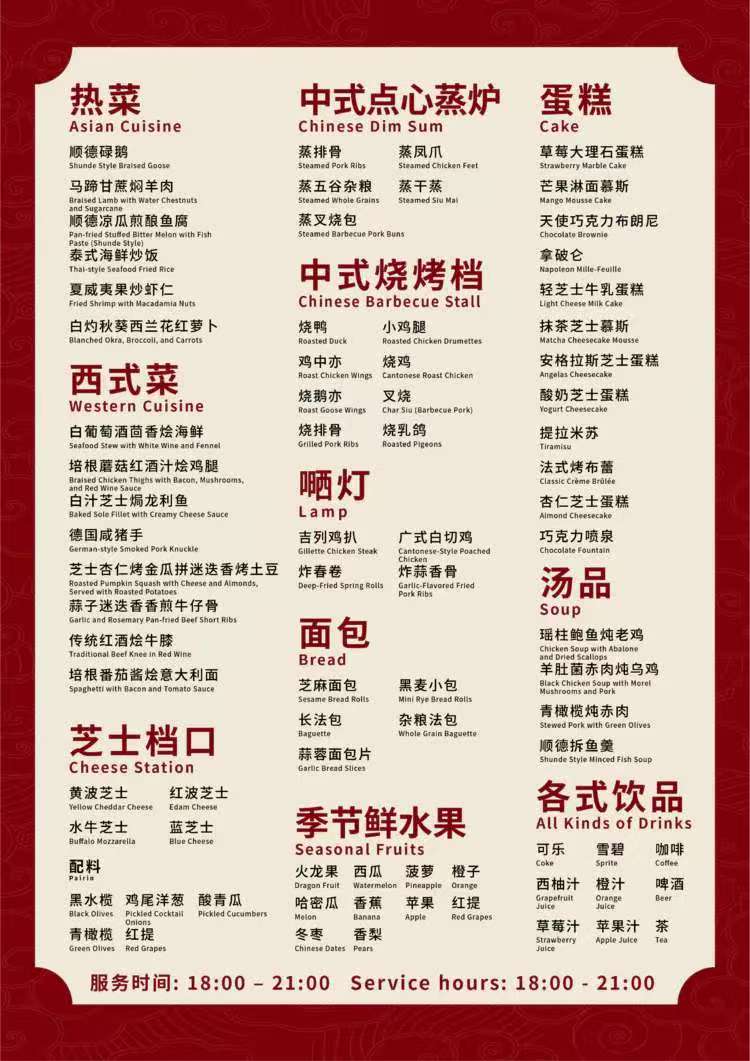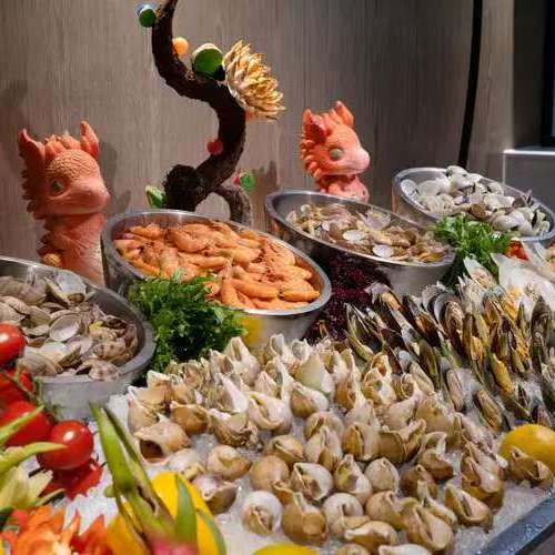 海鲜、刺身、中式点心、热菜烧烤、水果、汤等