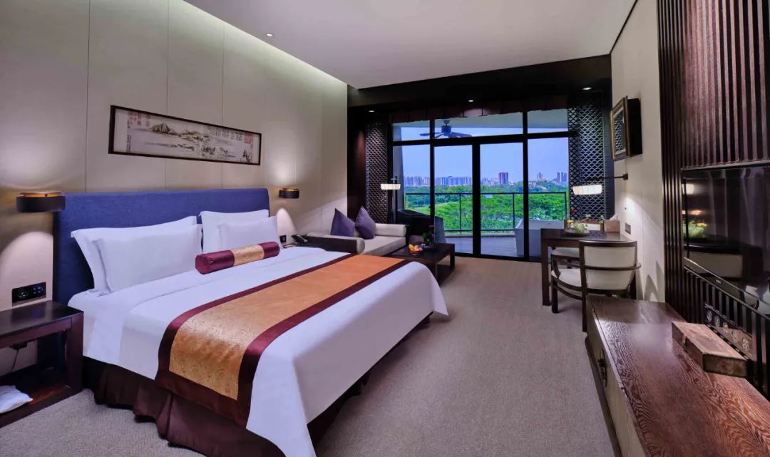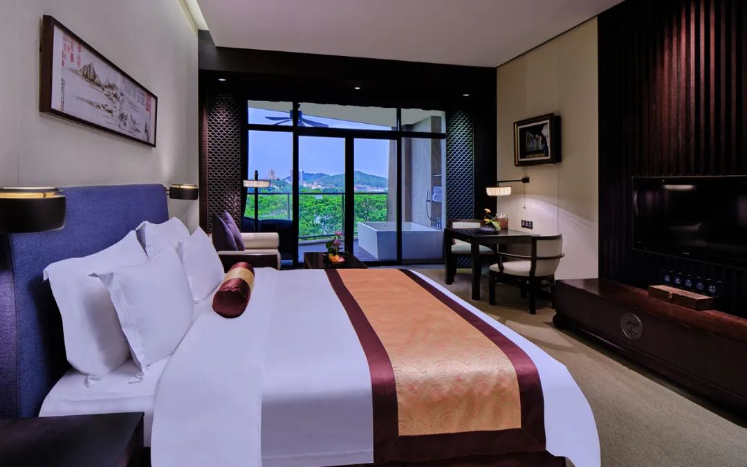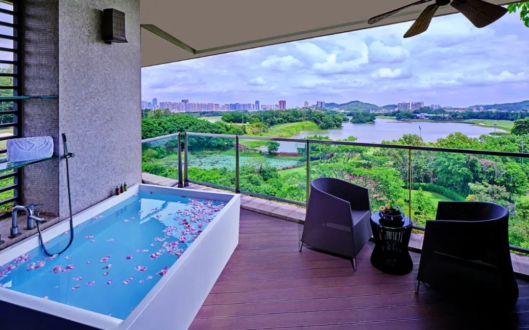 每间客房都拥有宽敞舒适的住宿空间,配有视野开阔的观景阳台+浴缸,一边泡澡一遍尽享美景。白天是绿意覆盖的高尔夫球场及龙湖水域美景,夜晚徐徐凉风吹来,全身心都得到放松!