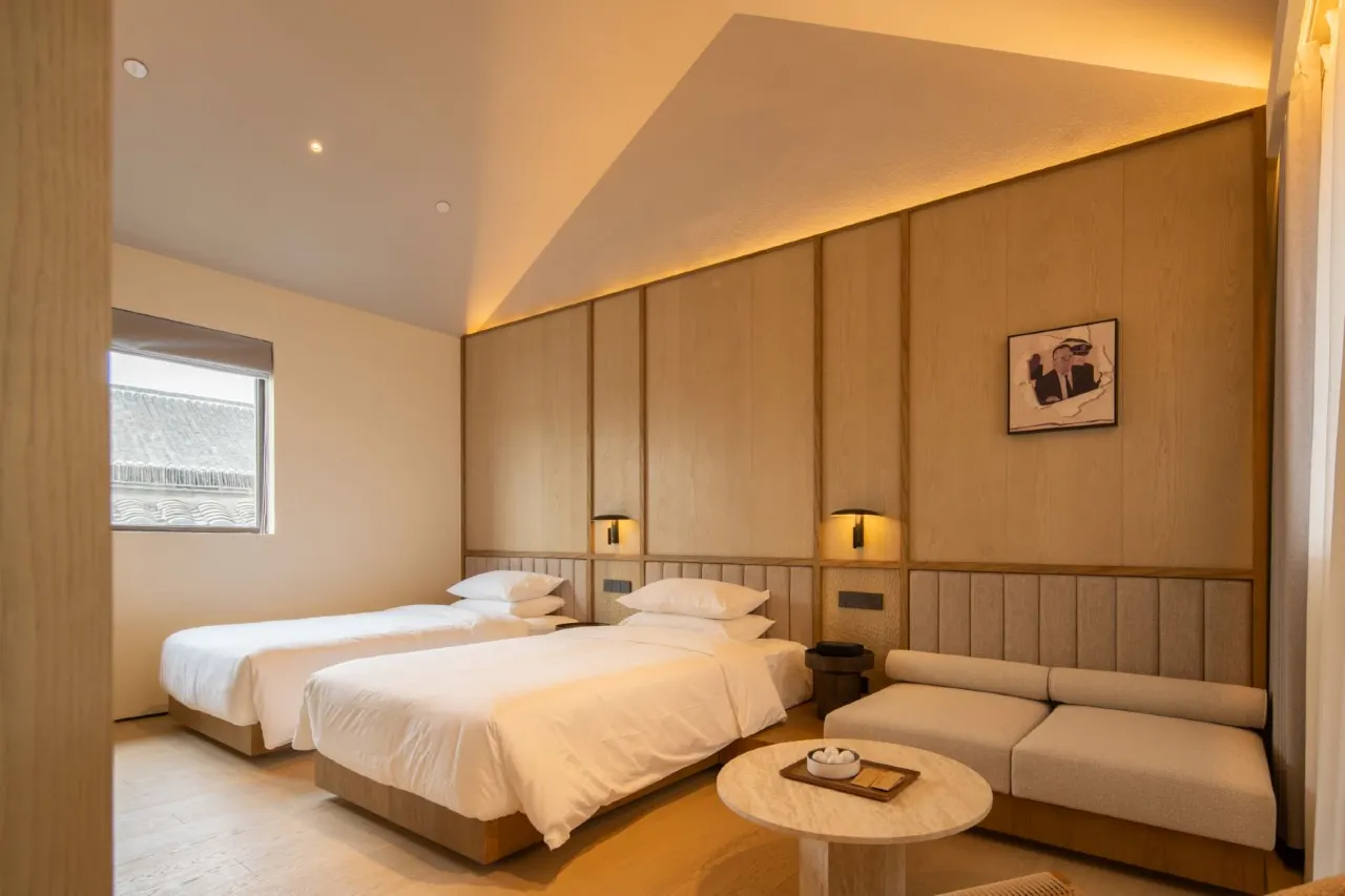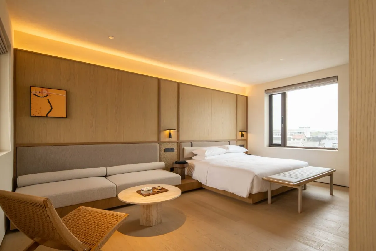 配置奢华,设计也出彩,客房内部均摆放着温润感拉满的木质家具,一房一景,一窗一画,夜里枕着隐约的市井声入眠,清晨被鸟鸣唤醒,度假休闲感max。
