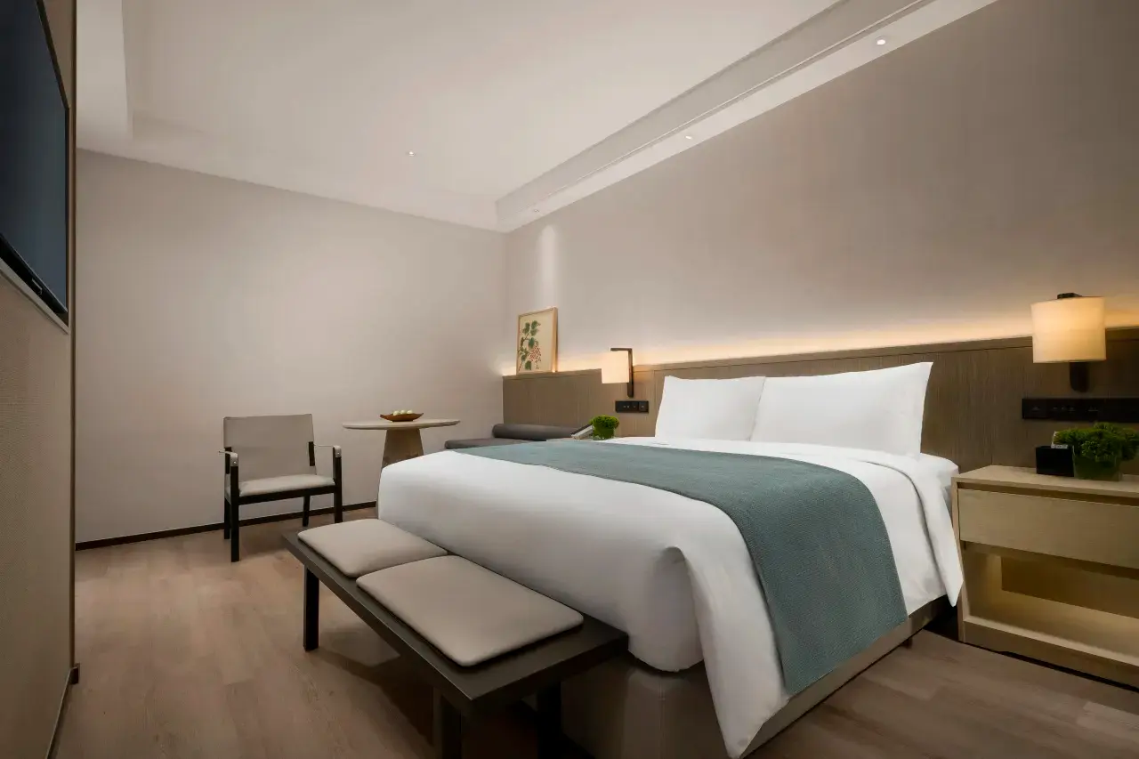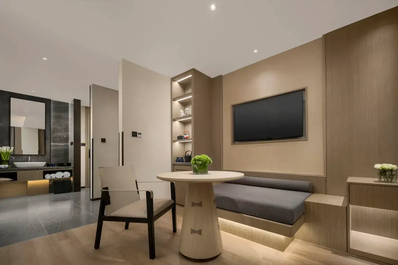 从进入大堂开始,你就能感受到设计师的用心:将山水烙印在每个细节,高悬在大堂上空的水晶叶片,如璀璨江南一般。