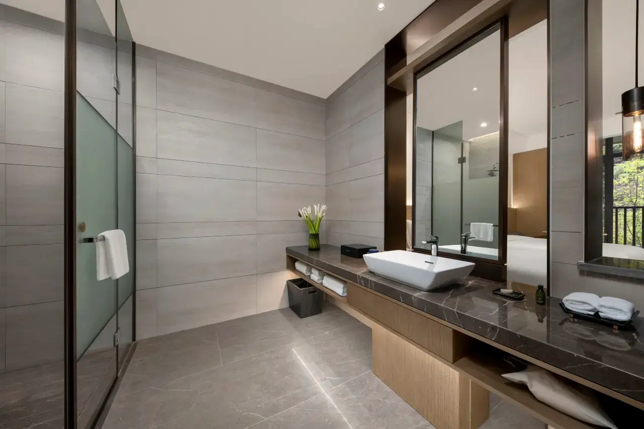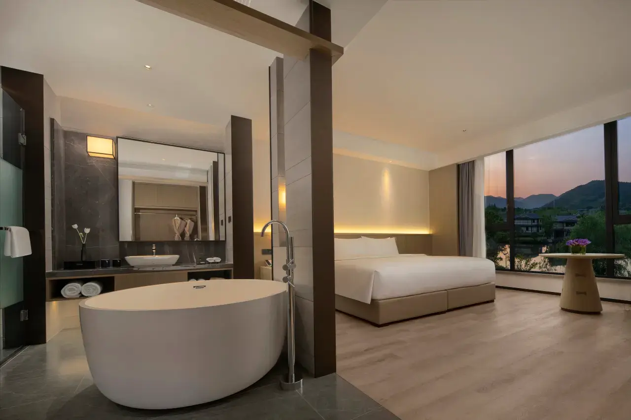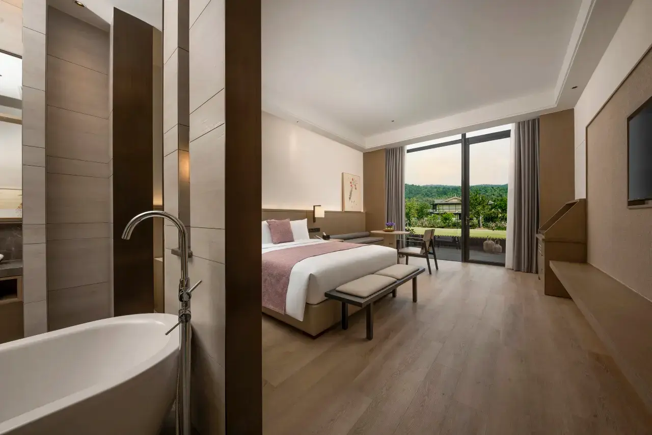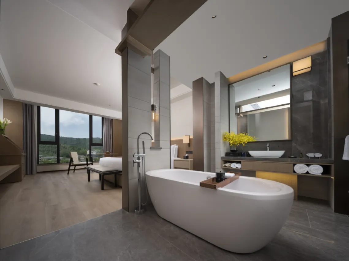 酒店主楼面积24000㎡,拥有山景房、湖景房、泳池房、行政套房、亲子家庭房等各类共有136间。同时还有36栋院墅,分别散布于湿地、茶山和竹林果园之间。