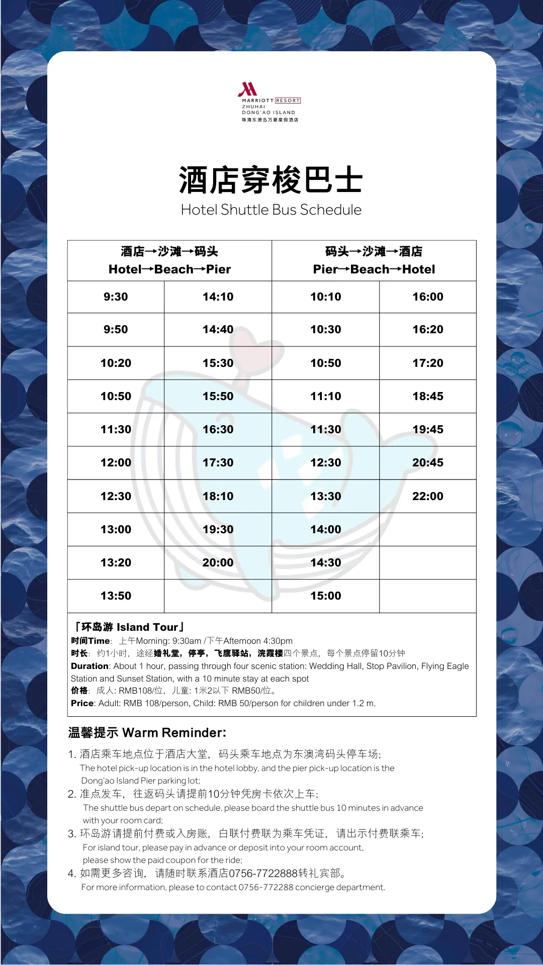 2.酒店班车时间会根据船舶班次同步调整,请提前致电酒店礼宾部咨询。