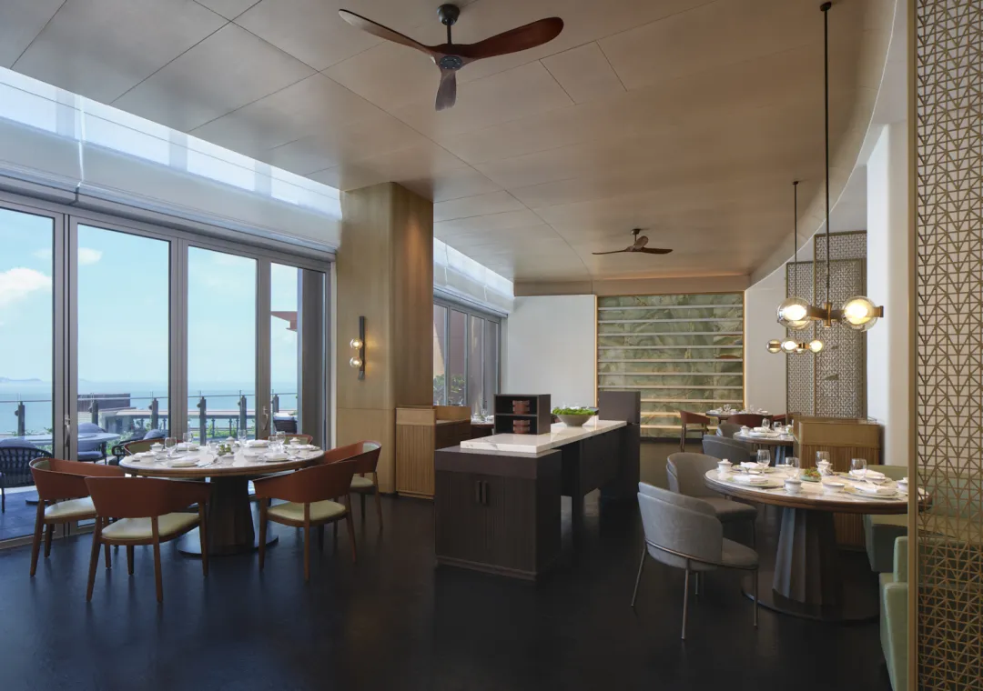 万豪中餐厅位于酒店一层,大厅将提供大约50个海景座位,3个独居特色风格的包房(1间海景房,2间山景房)。