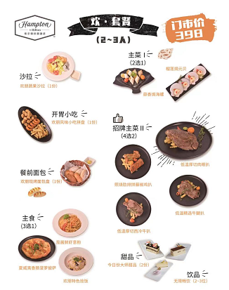 4、人数不足更换牛扒套餐菜单:餐前面包、美式炸薯条1份、健康蔬菜沙拉1份、芦笋奶油南瓜汤2份、煎烤西冷生排配墨胡椒汁2份、煎烤香草鸡扒配黑胡椒汁1份、鲜虾茄汁意天利面1份、8 寸榴披萨1份、提拉米苏蛋糕2份