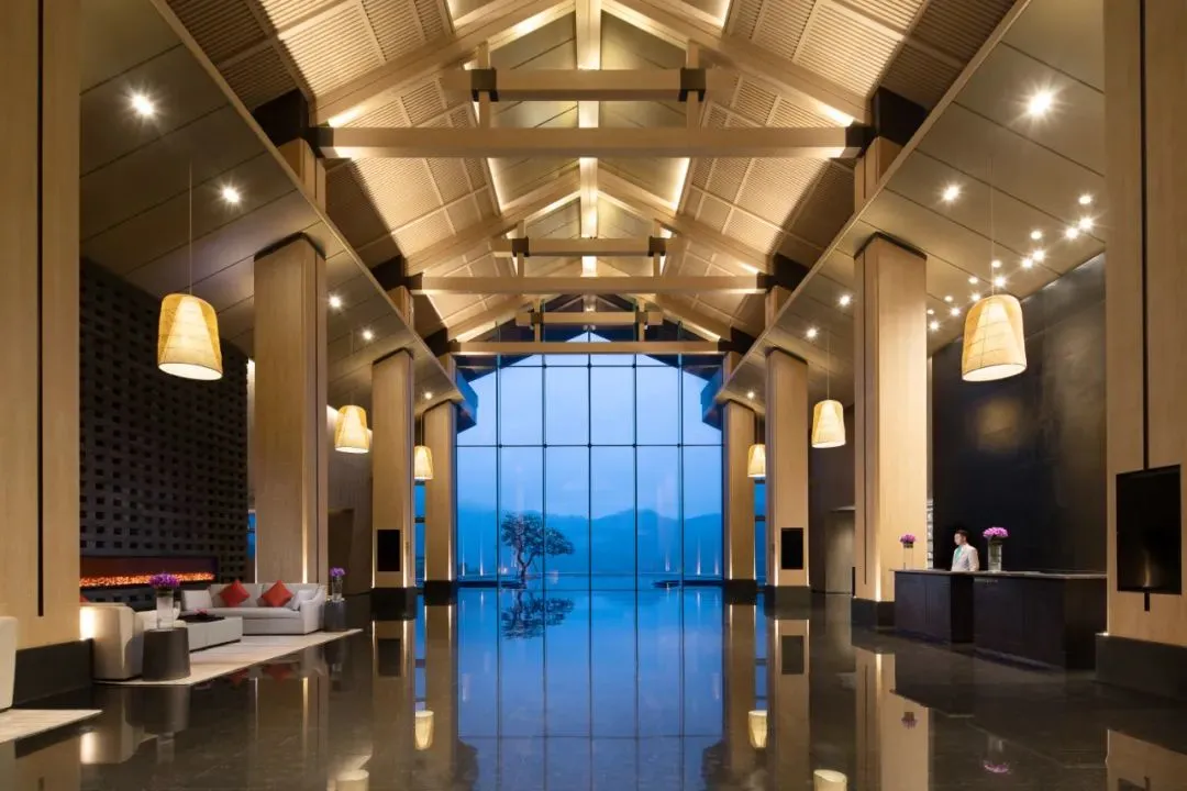 在设计上,巴厘岛金巴兰度假风格大堂外的镜面水景,倒映着斑斓山色挑高通透的大堂也能将至美的自然风光画作尽览!