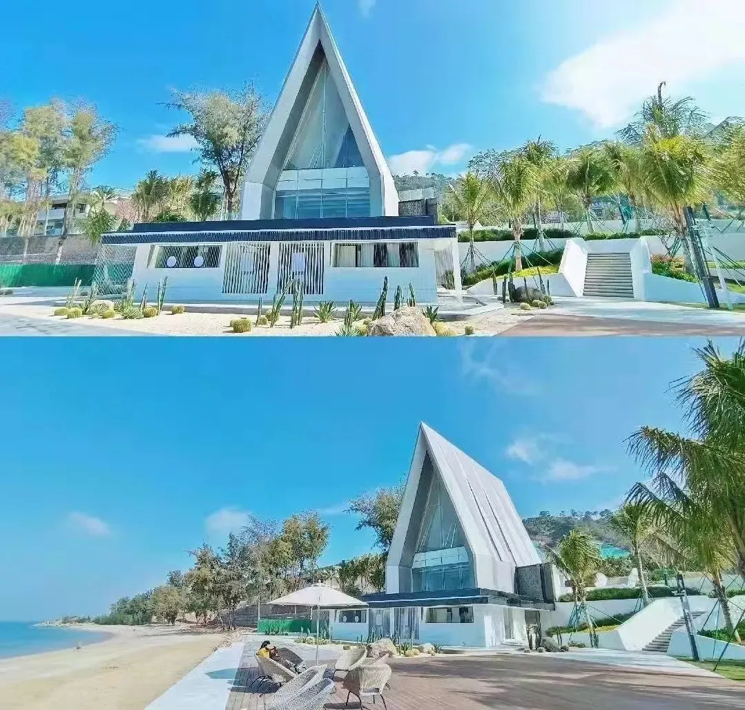 三角尖顶的造型巨大的落地玻璃窗,直面大海