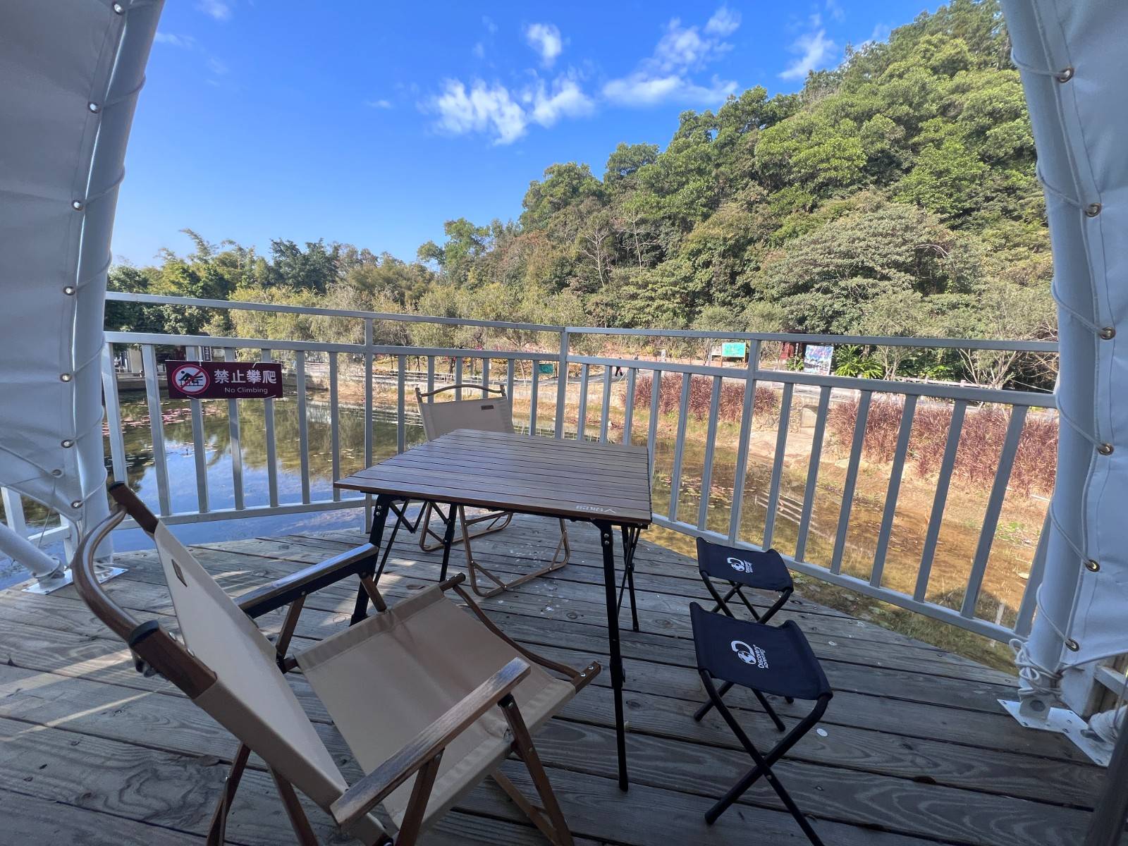池边露营,拥有一体式独立卫浴间,配备2张1.2米床,有小空调、茶壶。