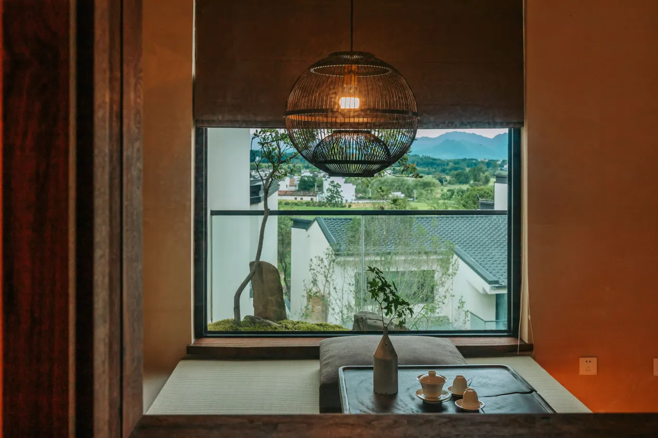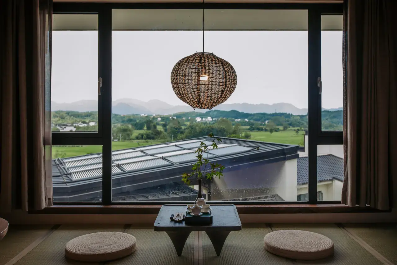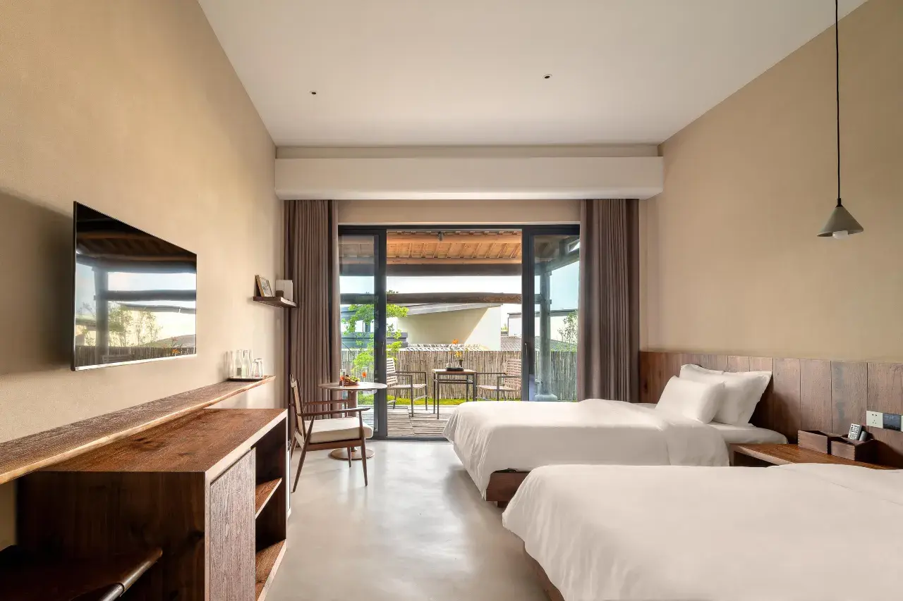 15栋新式徽派园林别墅,37间房间都配备现代化智能管家,设计理念出自无名初酒店的创始人-陈熙,靠山面田、以山水阡陌入景,造园林楼阁隐世。