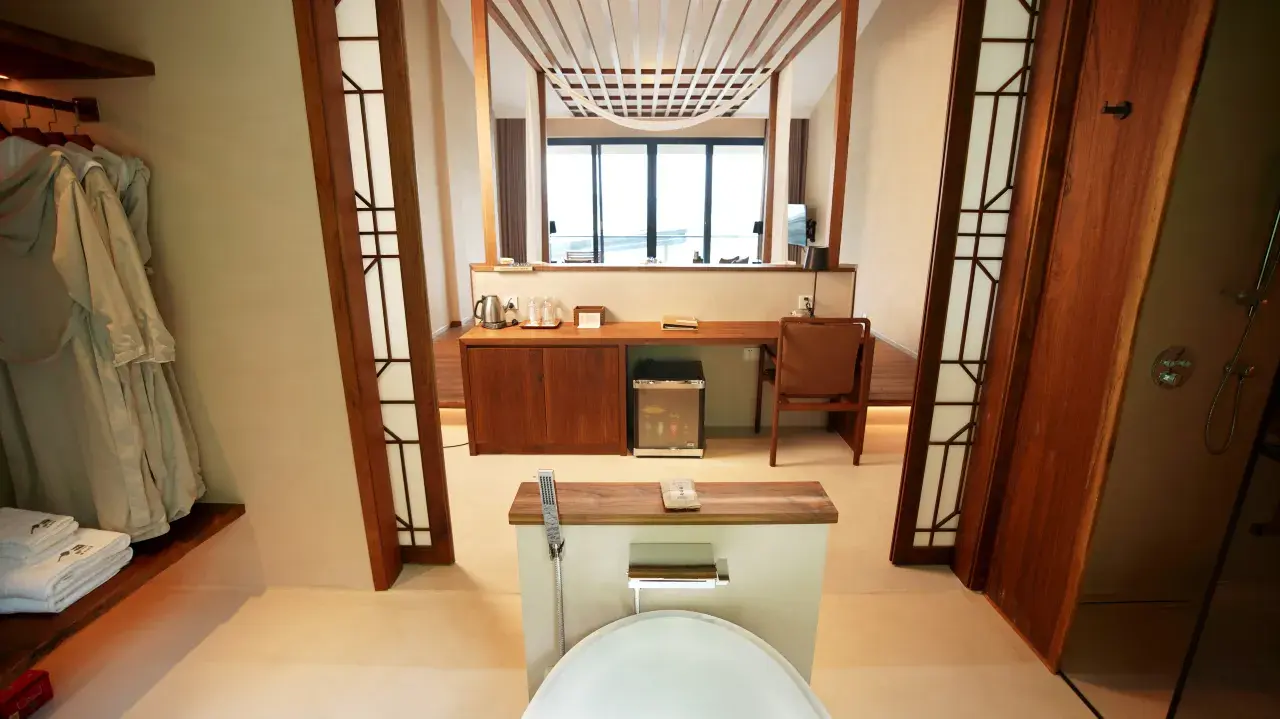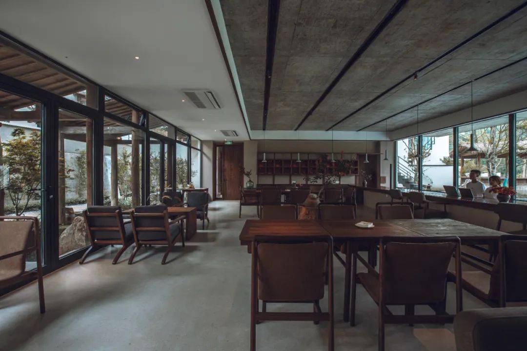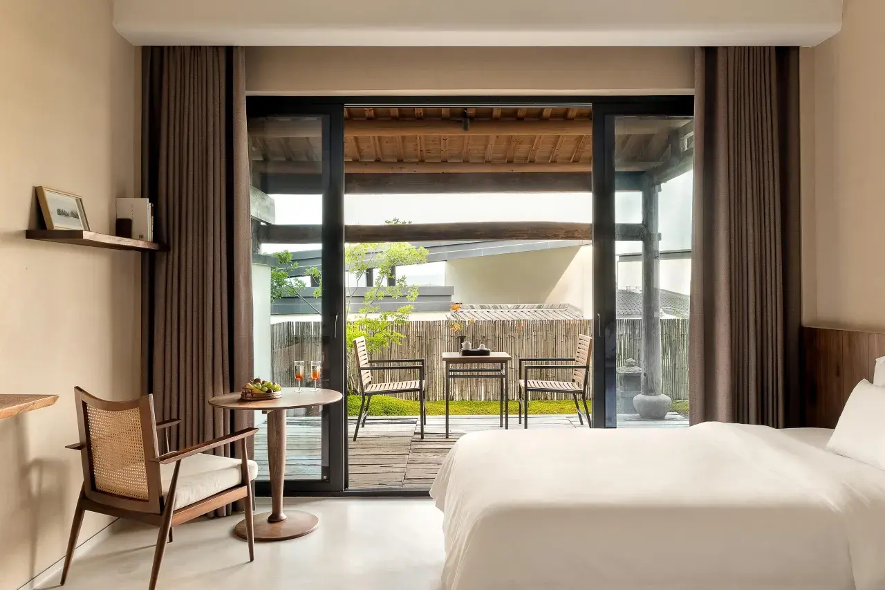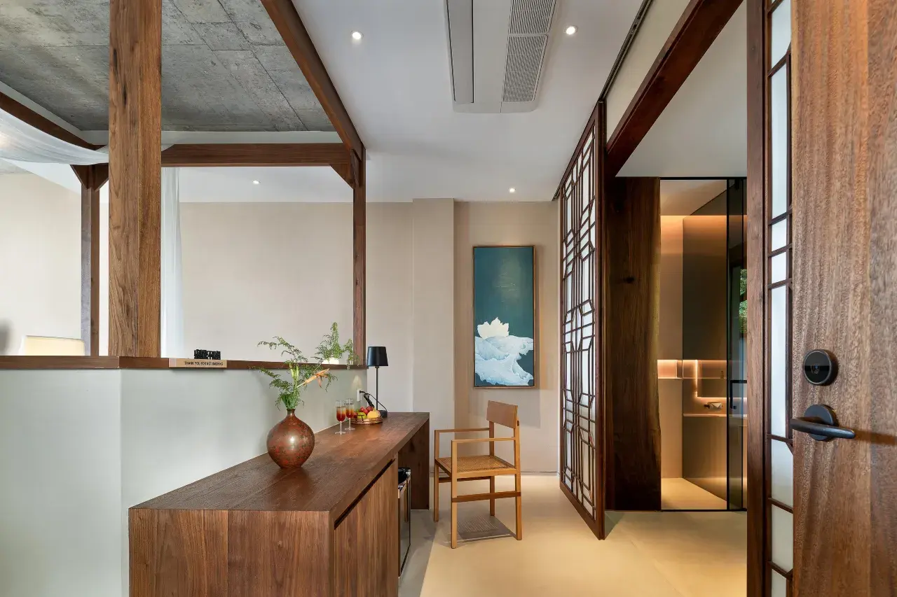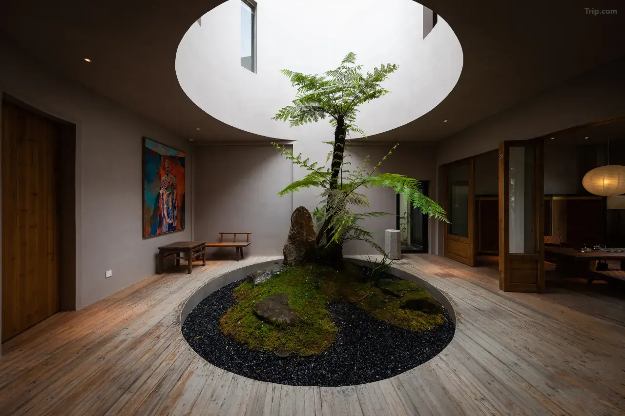 酒店内则呈现了一派东方生活美学空间,茂林修竹,曲水流觞,富有禅意。