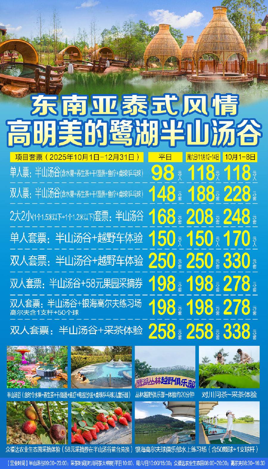 【半山汤谷免费配套】干蒸/湿蒸/桑拿浴室、拖鞋/毛巾/储物柜、鱼疗池、时令水果、养生茶、独立视听效果电视/沙发、桌球室/兵乓球室/儿童乐园。