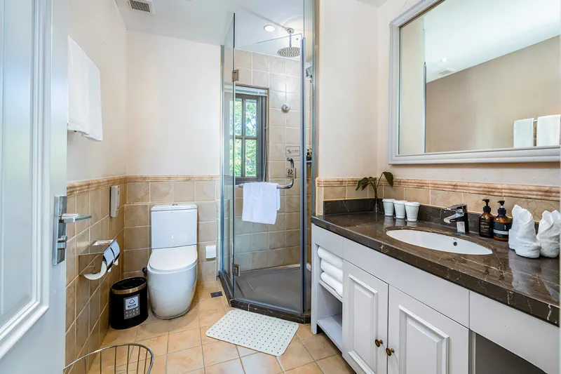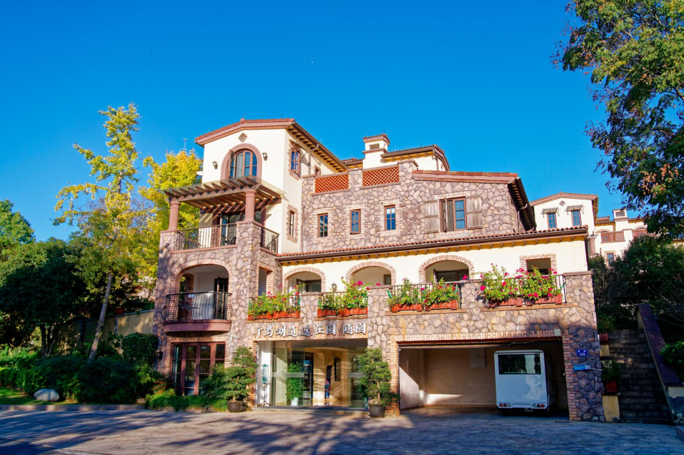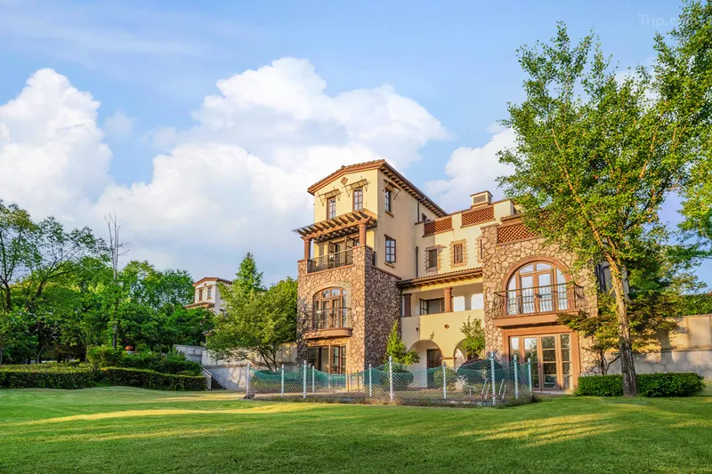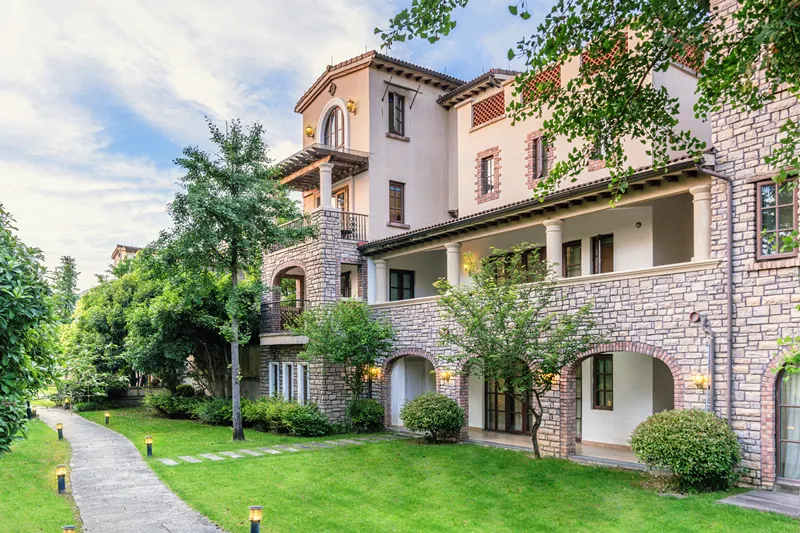 远远望去,酒店仿若从童话中走出的梦幻居所。暖黄与石色交织的外墙,搭配复古精致的窗棂、露台,满满托斯卡纳风情扑面而来。周围绿树如盖,草坪如茵,与澄澈蓝天、绵柔白云相映成趣。阳光洒落时,建筑在光影里更显典雅浪漫。