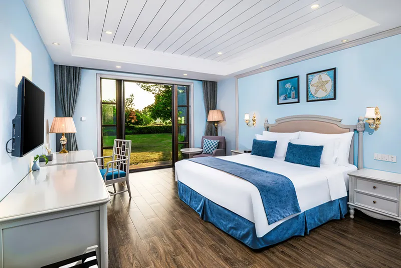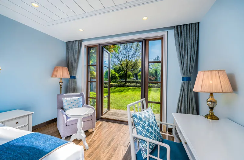 想带毛孩子开启惬意旅居?来这间庭院大床房就对啦~清新的蓝白主色调,像把海边的清爽全搬了进来,墙上海星、海洋元素挂画,更添几分灵动。推开落地窗,绿意盎然的庭院就在眼前,毛孩子能撒欢奔跑、嗅闻探索。室内大床柔软舒适,窝在上面超解压,旁边还有精致座椅,能伴着庭院景致,和毛孩子一起享受悠闲时光。