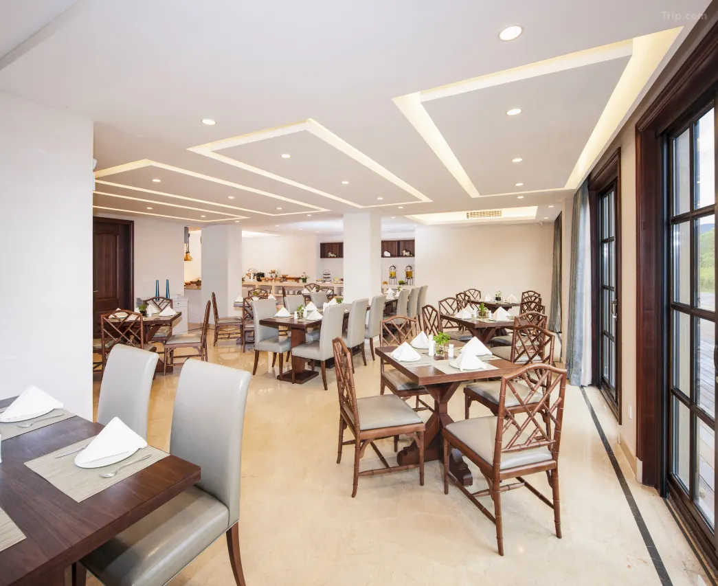 餐厅简约雅致的桌椅整齐排列,柔和灯光透过巧妙设计的天花板洒下,营造出温馨舒适的氛围。精致餐位上,餐具摆放有序,绿植点缀其间,透着几分小清新。