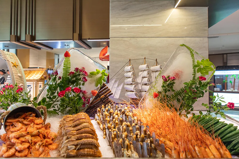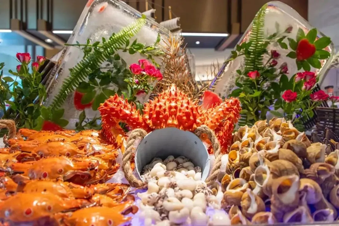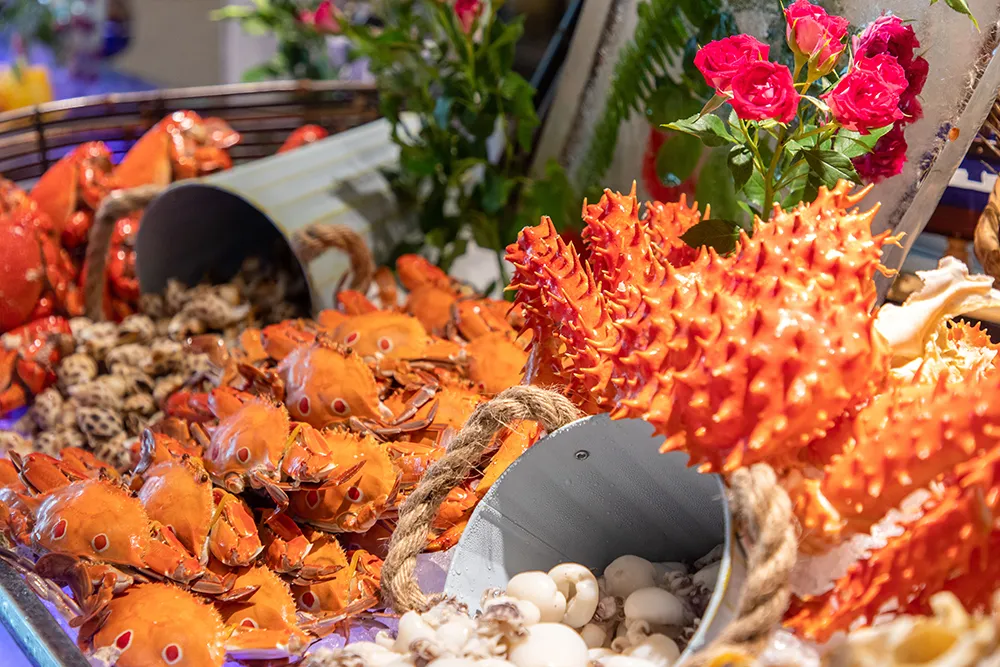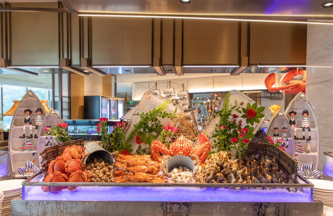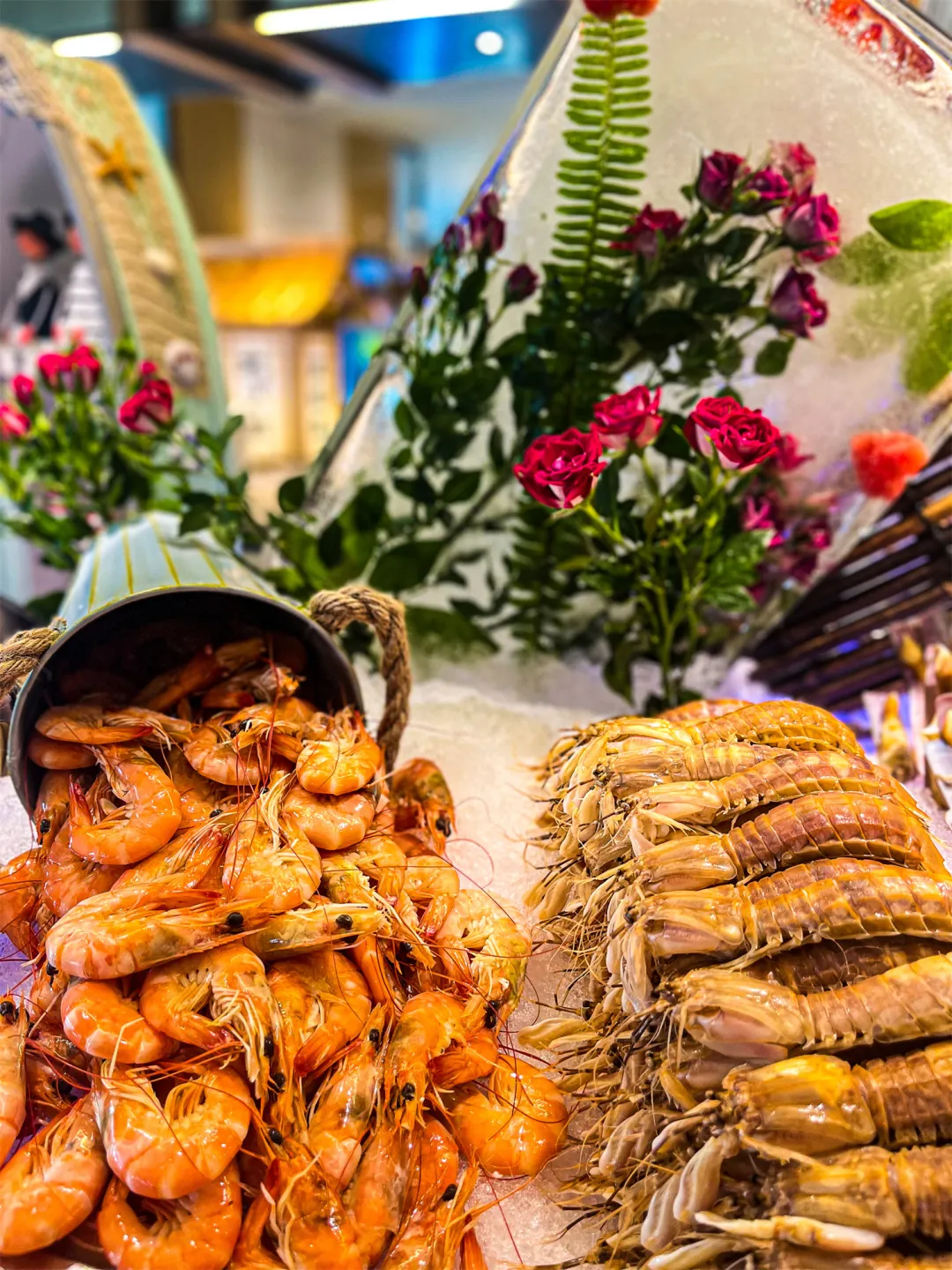 除此之外,还有小龙虾、阿拉斯加蟹腿、大虾、螃蟹等生猛海鲜和法式铁板等200+款环球美食。