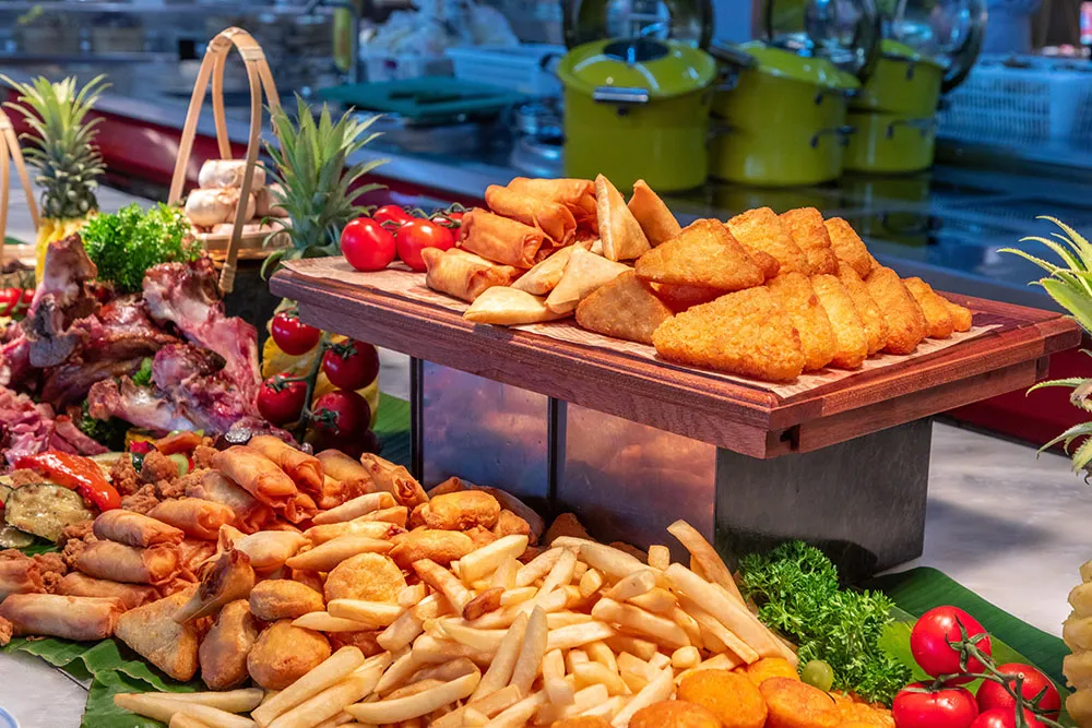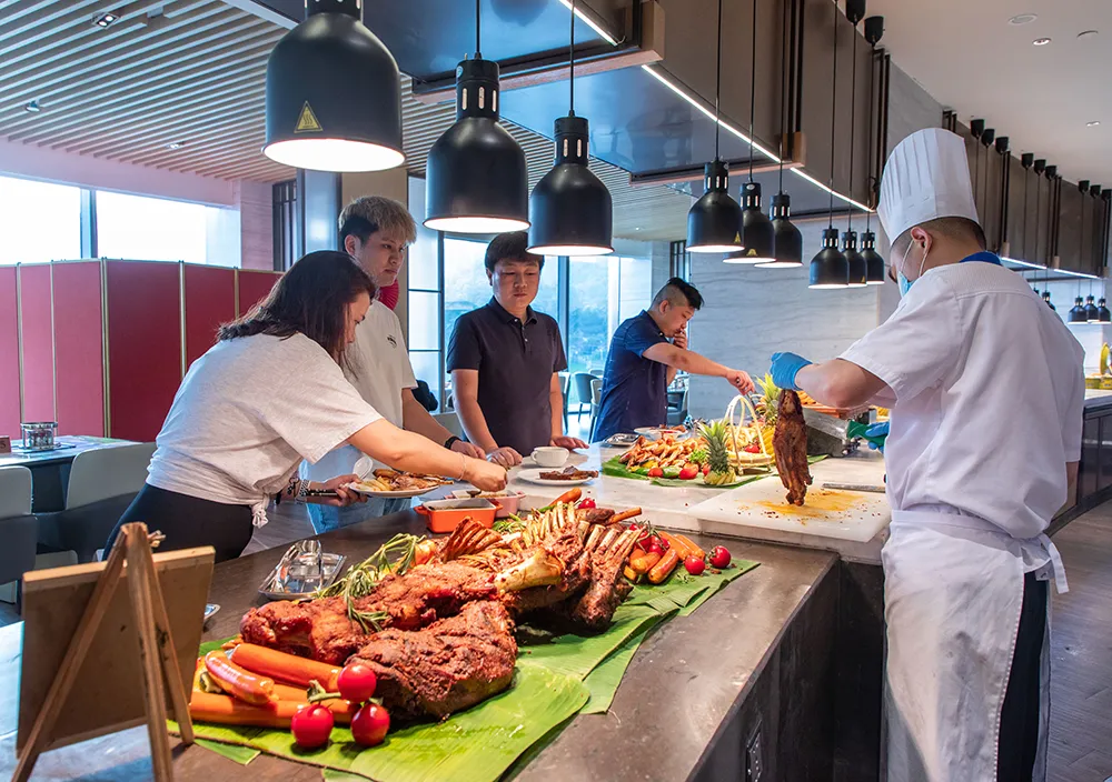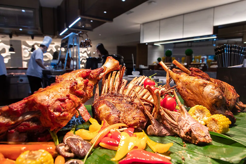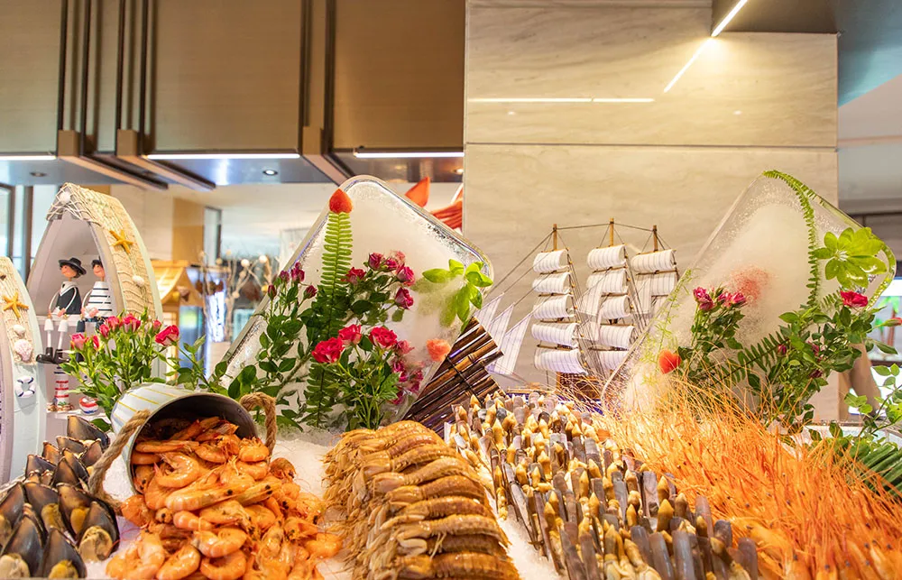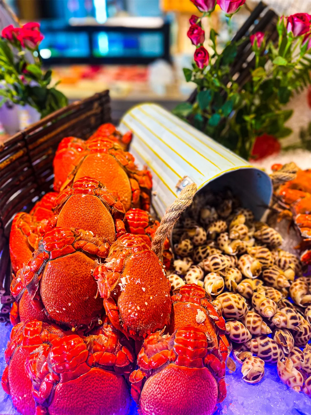 除此之外,还有小龙虾、阿拉斯加蟹腿、大虾、螃蟹等生猛海鲜和法式铁板等200+款环球美食。