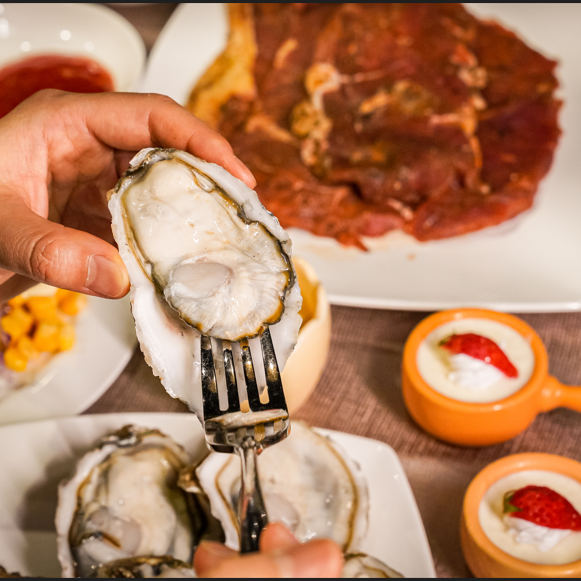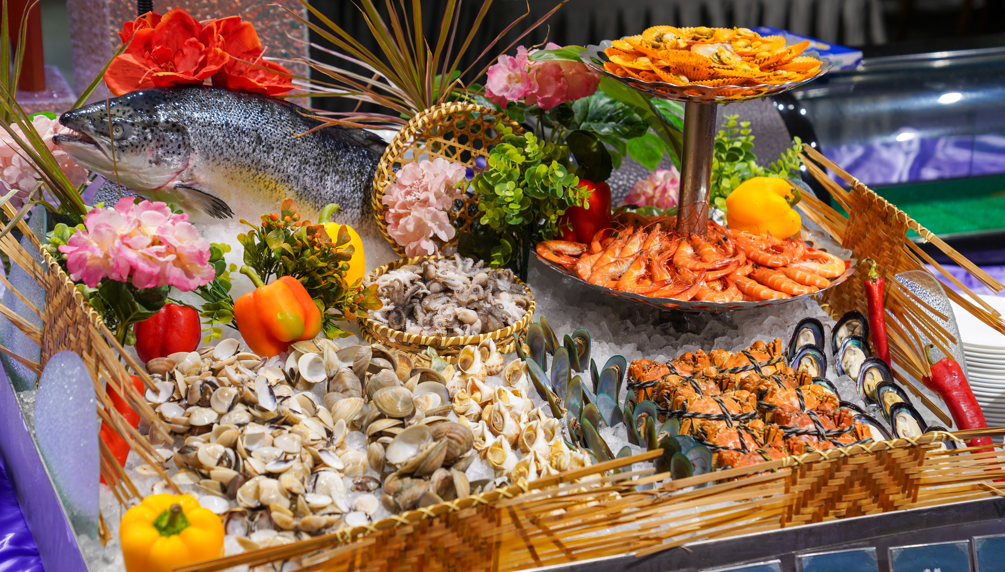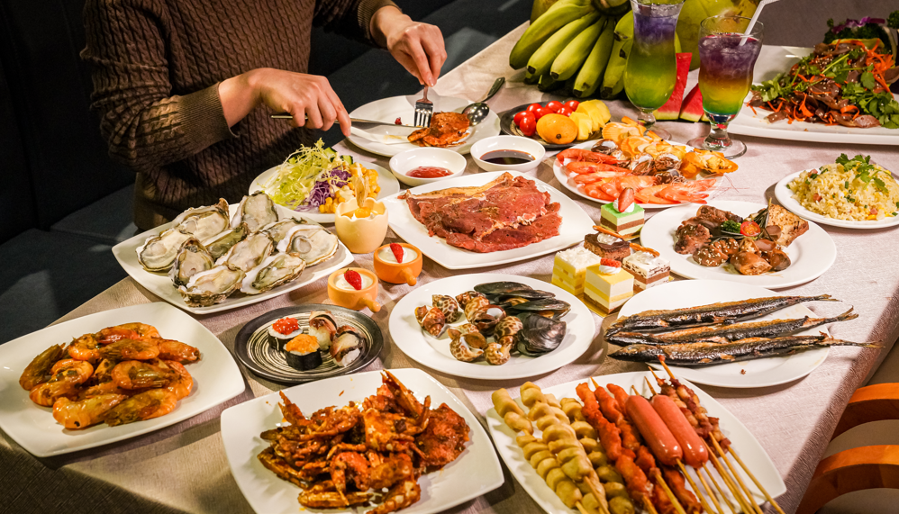 有海鲜、卤制品、烤肉、果汁饮品、水果应有尽有