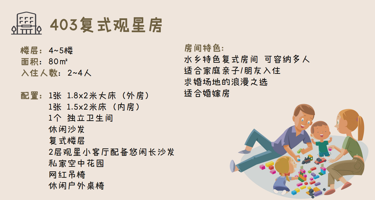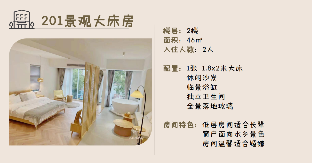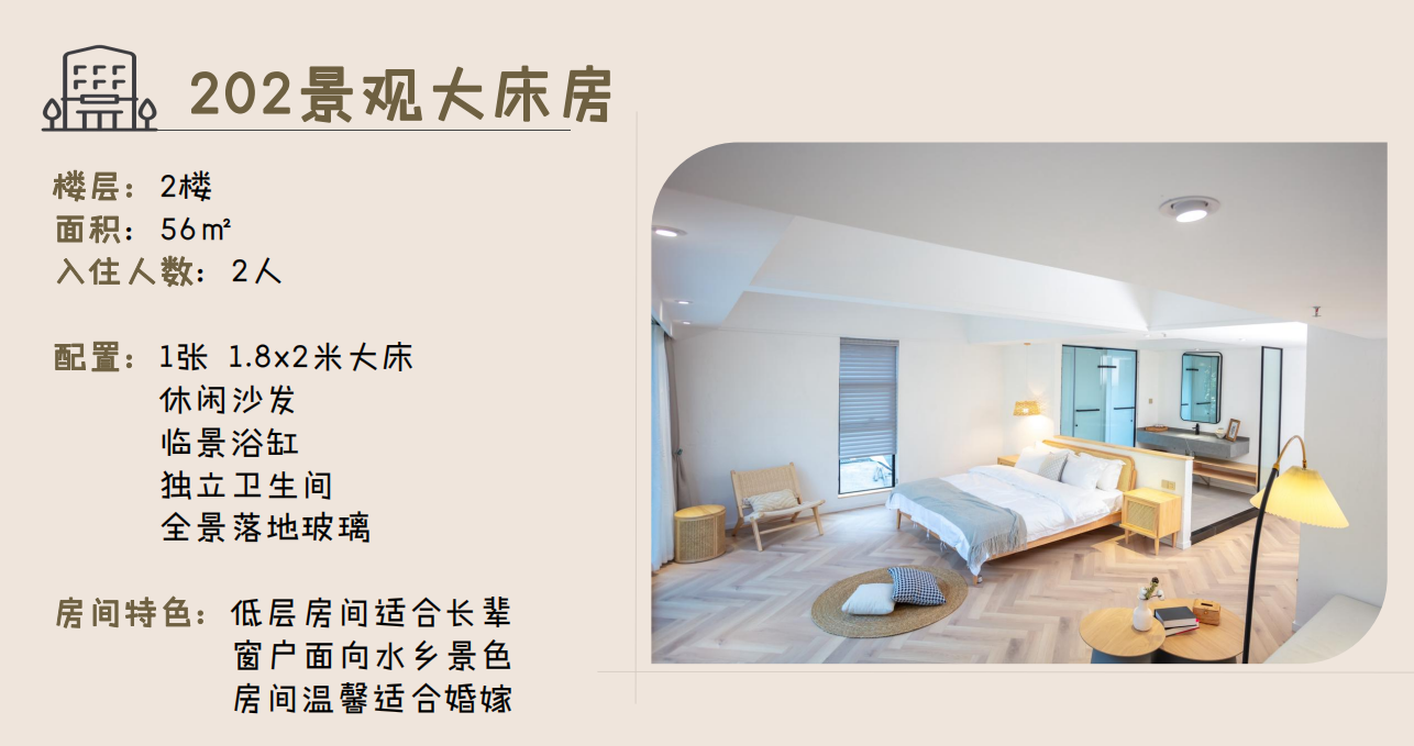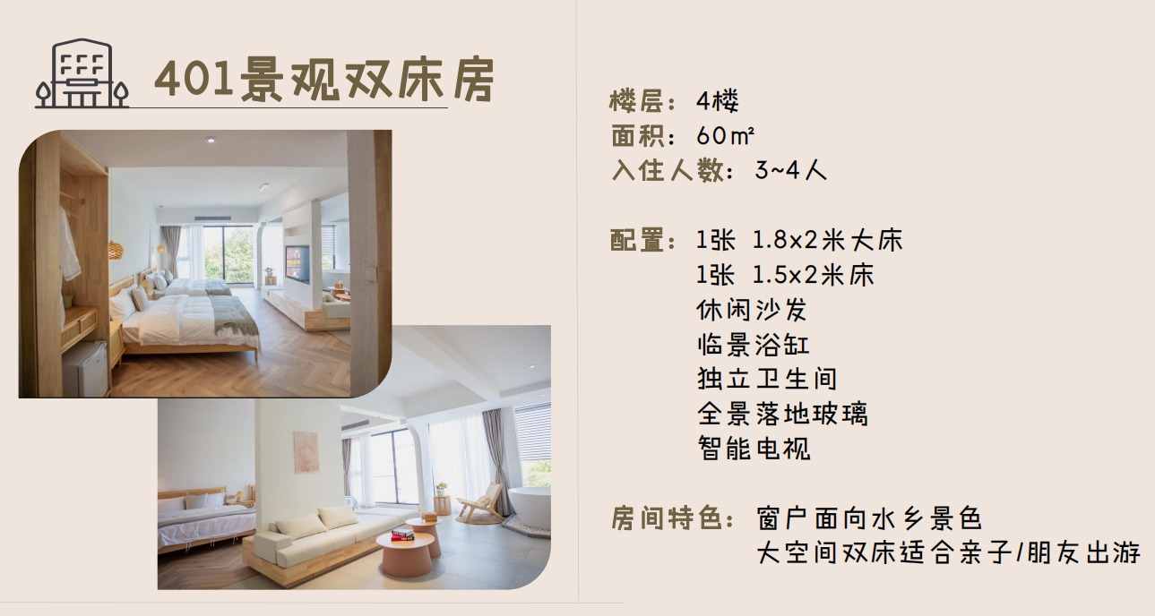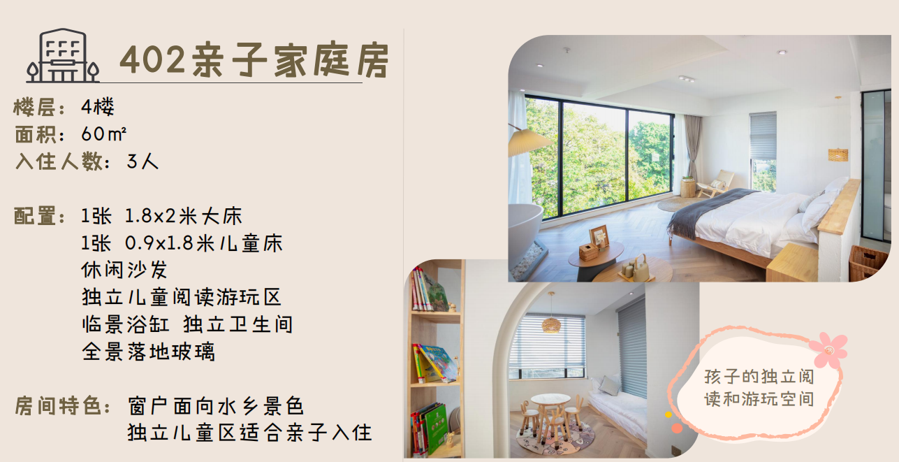● 升级201/202水乡全景大床房另+30元/间夜;升级301/401水乡全景大双床房、302/402水乡全景家庭房另+90元/间夜