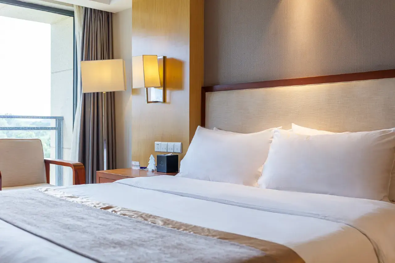 园林风景之中,酒店共有一栋主楼、一栋贵宾楼,以及8栋纯木质别墅,可为宾客提供260间精致客房,每一间都可观景。本次套餐入住主楼·园景房,面积32㎡起跳,空间舒适宽敞,设有180°观景落地窗,可赏碧绿园景,同时引入无敌光线,客房视野明亮。