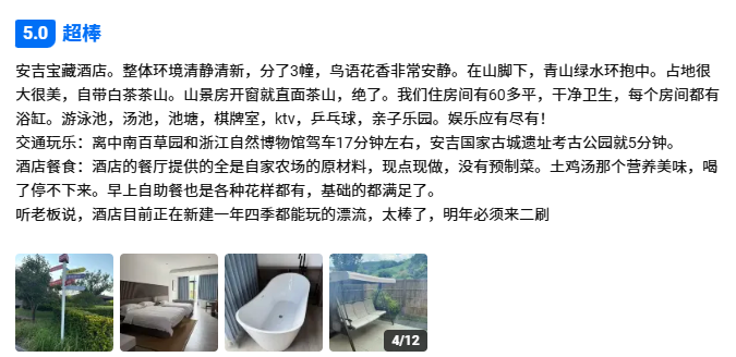 酒店位于生态环境优美的安吉生态白茶基地,占地面积4万平,依山傍水,风光秀美,是一家集采茶制茶,采摘农耕,住宿餐饮,户外活动为一体,农旅结合、设施齐全的豪华酒店。酒店位于江浙沪3小时经济圈,距离上海2小时车程、杭州1 小时车程,高速路驱车从安吉北出口8分钟即到,距离安吉高铁15分种车程,地理位置优越,交通极为便利。