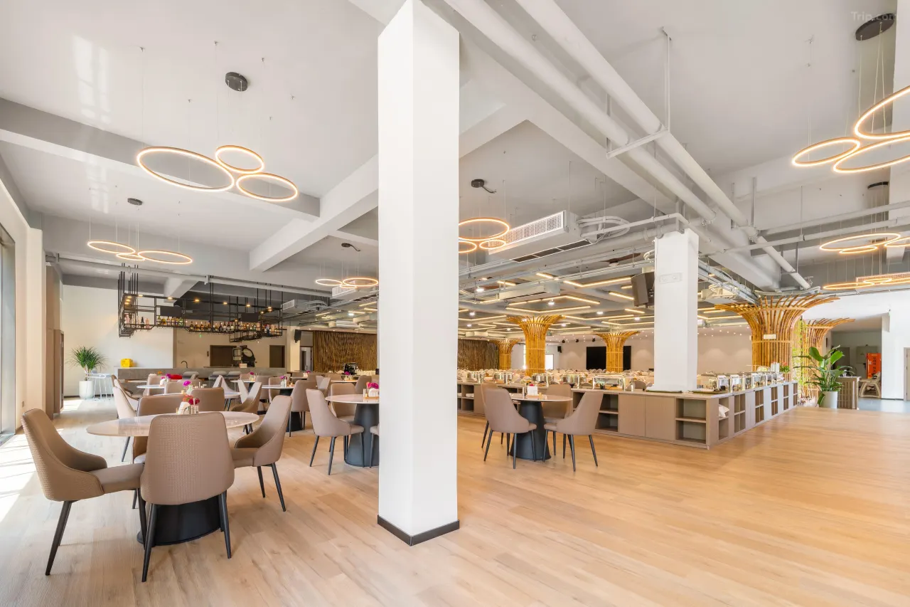 酒店餐厅共有餐位600个;设有宴会厅、西餐区、和别致