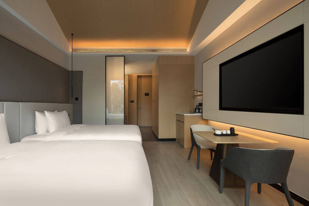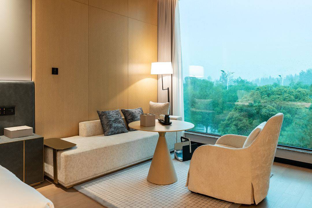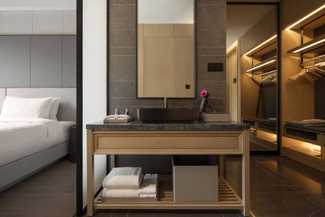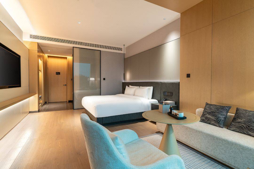 客房不仅面积大,配套设备也一应俱全,干湿分离卫生间、电动窗帘、智能马桶、多功能化妆镜等,都能满足日常居停所需。