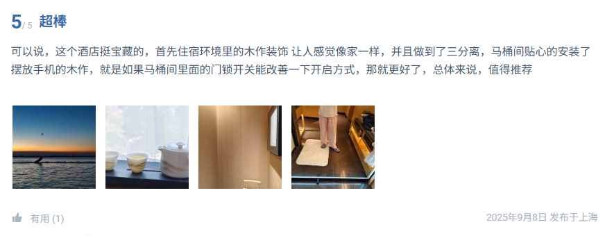 本次套餐入住雅致房。配备180°落地窗,引入无边光线,客房设计简约时尚,采用原木家居,为旅客营造了一个舒适的旅居空间。