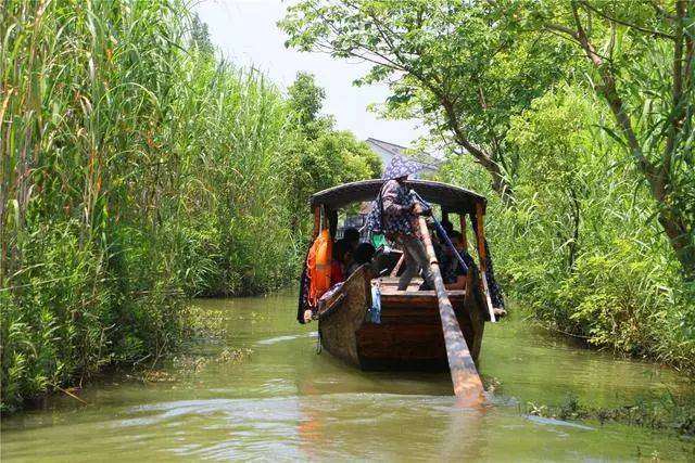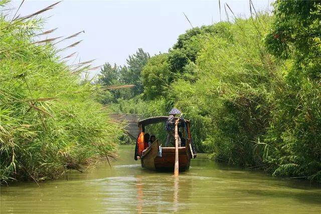 傍晚,乘一叶扁舟游入沙家浜,在芦苇荡绿色的帷幕里