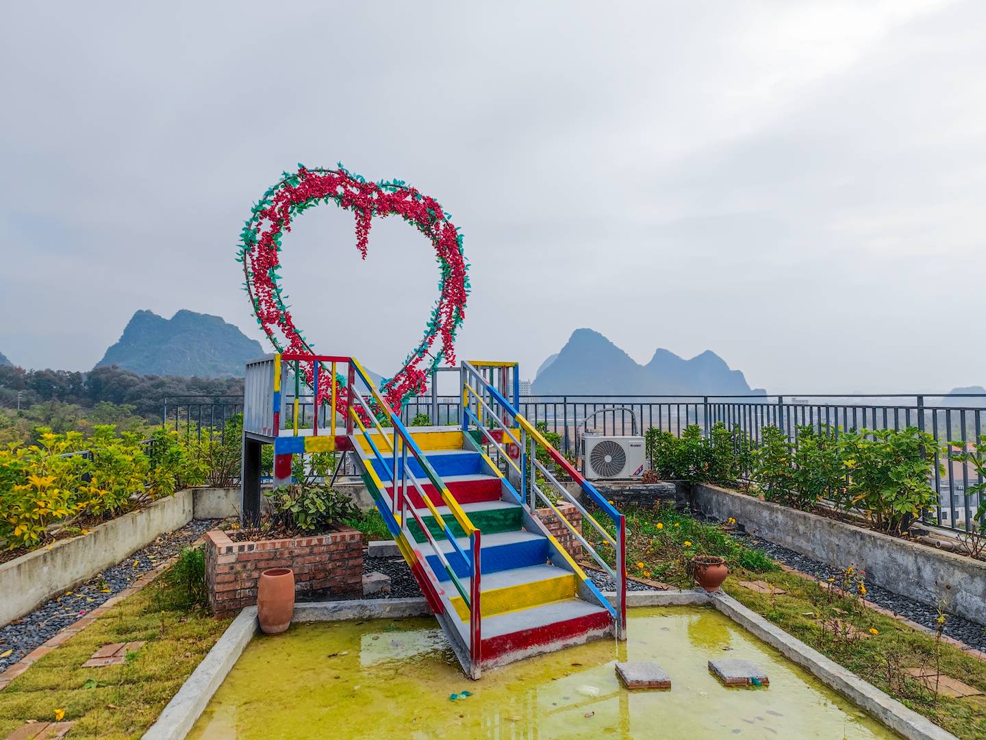● 九重天拥有着含氧量极高的森林氧吧,氧气负离子含量高达每立方厘米9300个!!这里清新怡人,走进山间小径幽然脱俗,休息的同时感受大自然的宁静,让人仿佛置身在一个与世隔绝的“世外桃源”。