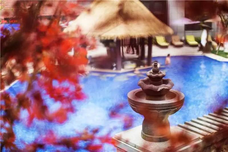 温泉中心,是整个酒店的核心区域。建筑面积18000㎡,室内外泡池都在这里:室内室外30个泡池,巴厘岛风格茅草亭、木雕石像,移步即可换景。每个泡池都很私密。