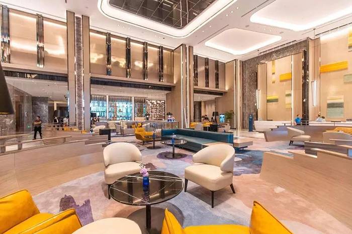 连大堂都是经过精心设计,酒店内部软装走法式风格,电梯间的水晶吊灯和金黄色的皮质地毯,别具一番风味。
