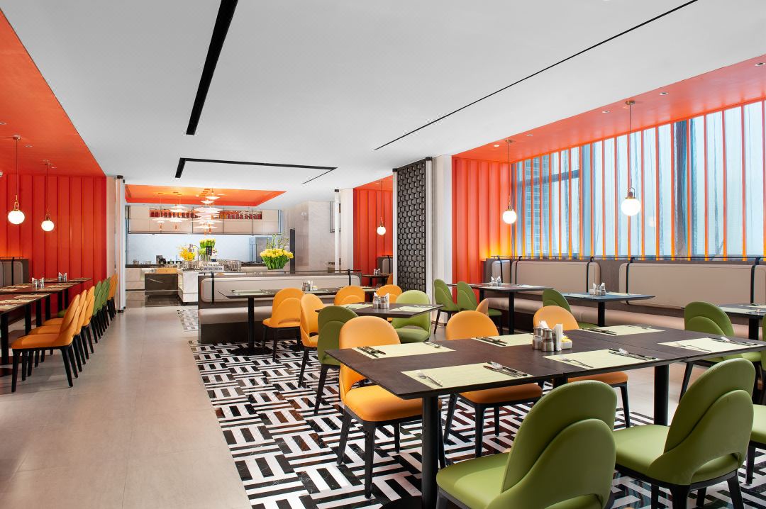 舒适用餐区,开放式厨房,简约现代的环境 、上百个品种的新鲜营养热早餐、种类丰富的简餐和蔬果饮品为您提供高品质的健康饮食体验,让繁忙的旅途增添一份欢愉和安心。