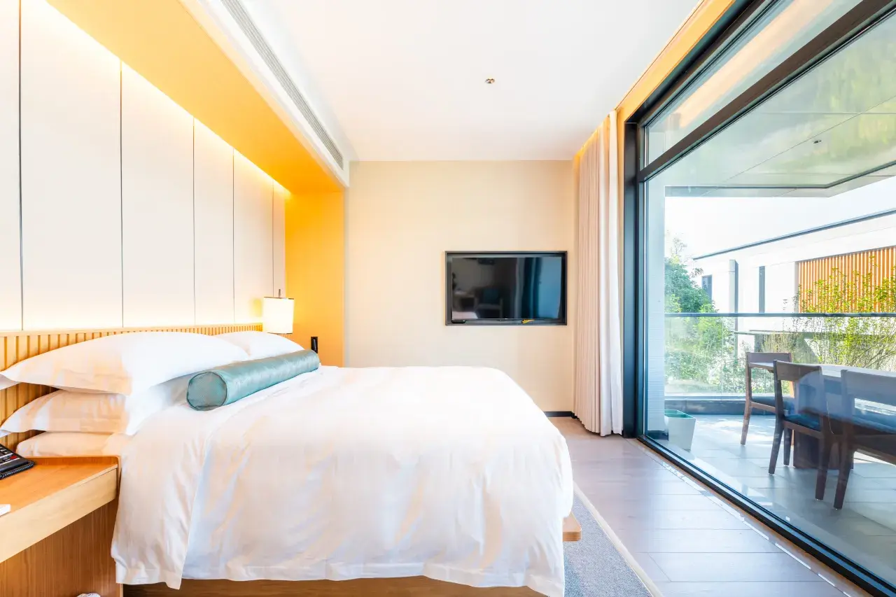 为了让每位住客与自然亲密接触,每间客房都设计了观景阳台和落地窗,让自然更迭的风光来得毫不费力,站着、坐着、躺着,总之不出房间,就能看到不同角度的建德美景。