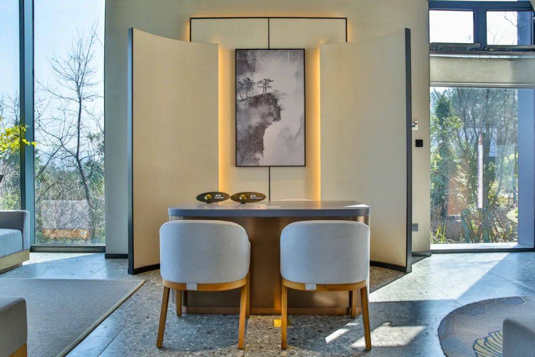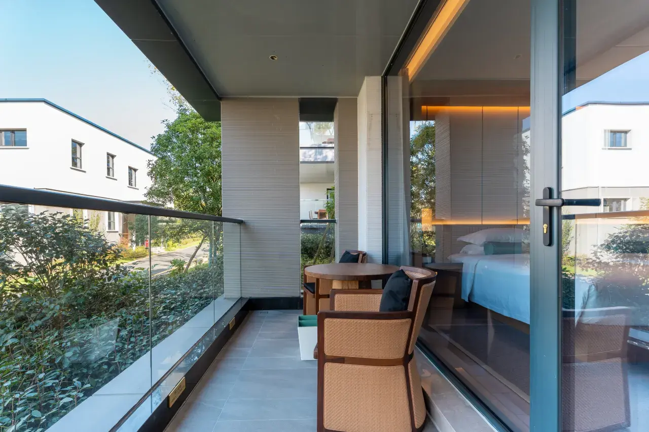 为了让每位住客与自然亲密接触,每间客房都设计了观景阳台和落地窗,让自然更迭的风光来得毫不费力,站着、坐着、躺着,总之不出房间,就能看到不同角度的建德美景。