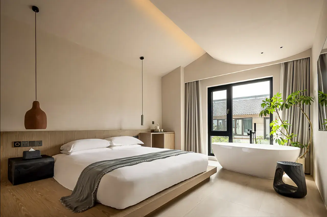 客房简约雅致的设计,让身心瞬间松弛。松软大床铺着洁白床品,搭着灰毯,似在温柔召唤。一旁的独立浴缸,静候你卸下疲惫。大窗将户外景致引入,绿植点缀更添生机,在这里,每一刻都是与舒适惬意的温柔相拥。