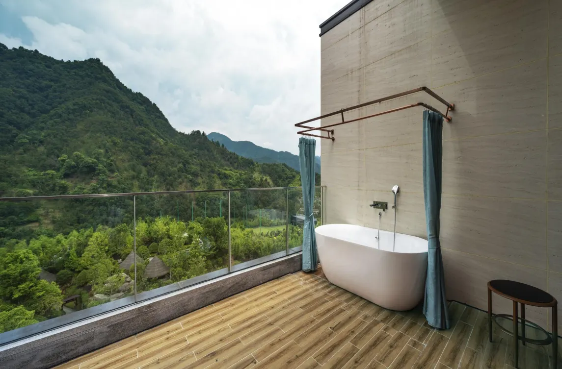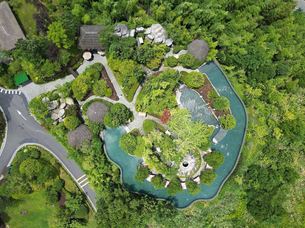 2021年开业的星泉谷度假村,位于临安湍口温泉小镇内,这里八山环翠,四水合流,不仅有成片的红豆杉林,更汇集了湍溪、塘溪、沈溪、凉溪,因此,便有了“四水落明堂”的美誉。