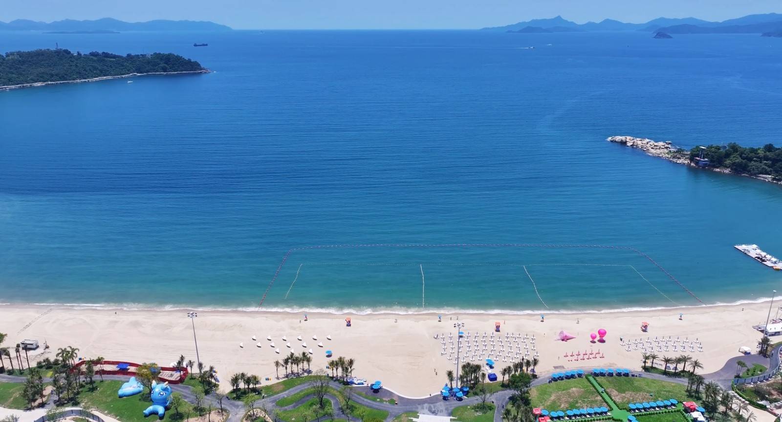 大梅沙海滨拥有深圳最长的海滩,海水清澈,沙滩广阔,沙质细软。园内金色的沙滩、蔚蓝的海水、轻淡的白云、碧绿的山峦、阵阵的椰风、飘香的花草,与轻松的音乐、点点的白帆所构成的亚热带海滨风光的旅游胜地。