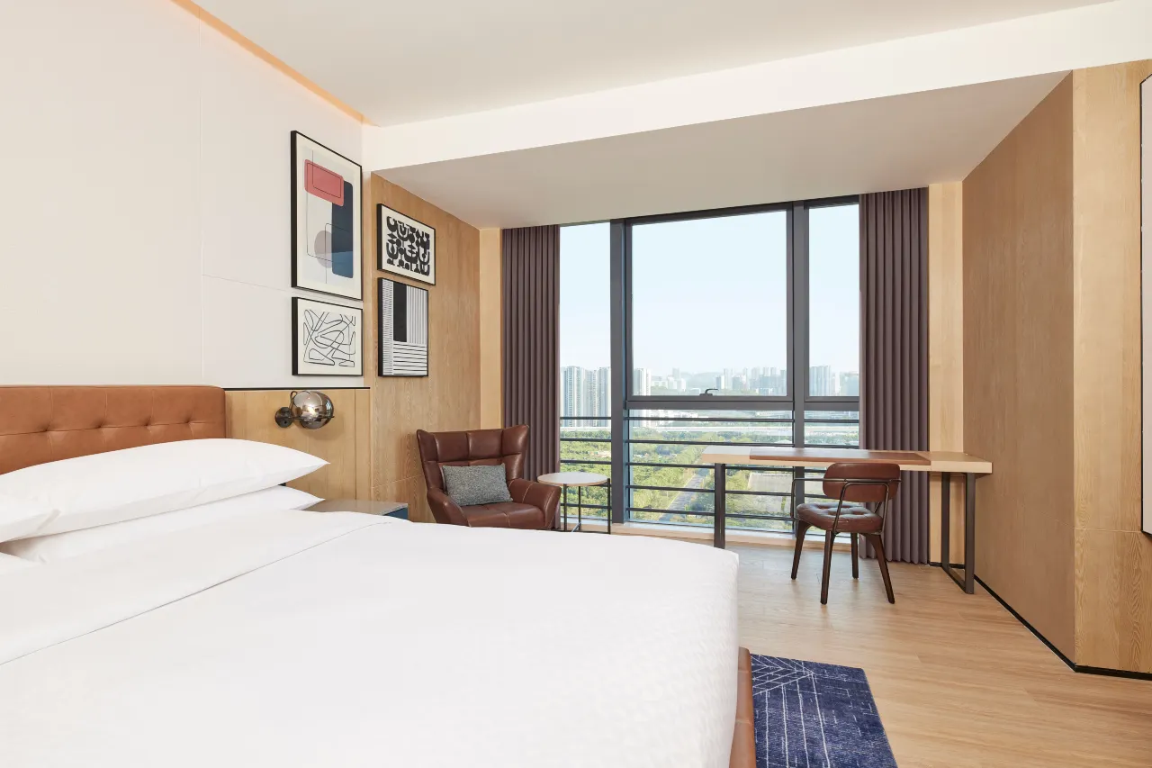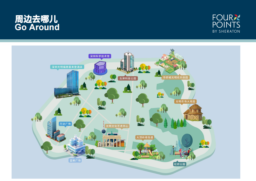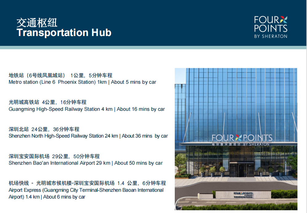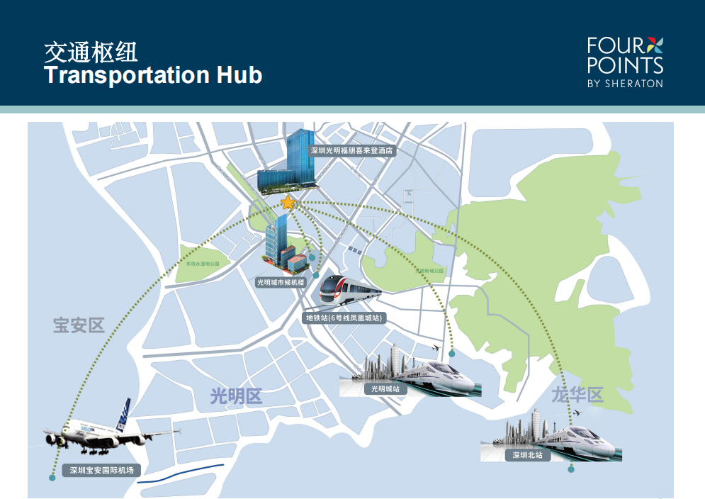 深圳光明福朋喜来登酒店位于光明区核心地段,毗邻各大交通枢纽、购物中心和人文景点。酒店距离凤凰城地铁站约1公里,光明城高铁站约5公里,优越的地理位置,是商务及休闲旅客探索光明的首要起点。