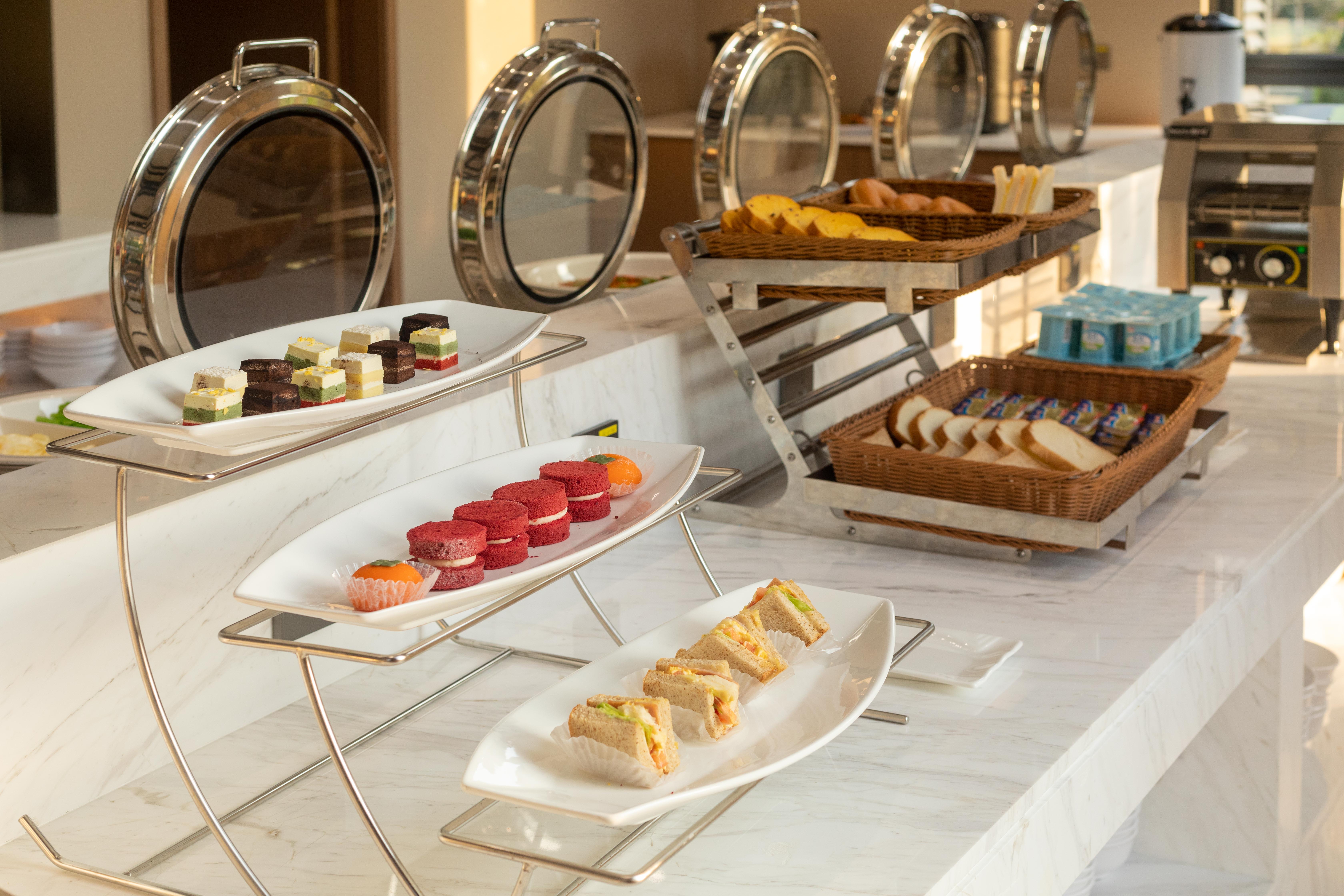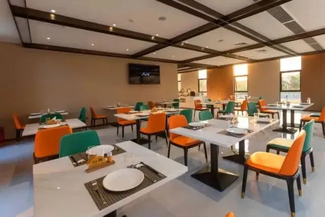 餐厅设计配色延续了灰色和金色,但在软装上使用孔雀绿、深橘棕,布艺材质更加复古典雅。餐厅提供了多样化的餐饮选择和优质的服务,是旅游或出差用餐的不二选择